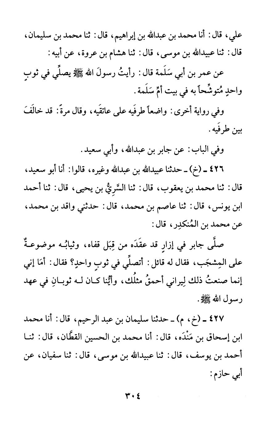 427 - (خ، م) - حدثنا سليمان بن عبد الرحيم، قال: أنا محمد بن إسحاق بن منده، قال: أنا محمد بن الحسين القطان، قال: ثنا أحمد بن يوسف، قال: ثنا عبيد الله بن موسى، قال: ثنا سفيان، عن أبي حازم: #305# عن سهل بن سعد قال: رأيت رجالا عاقدي أزرهم في الصلاة على رقابهم، كأنهم الصبيان.