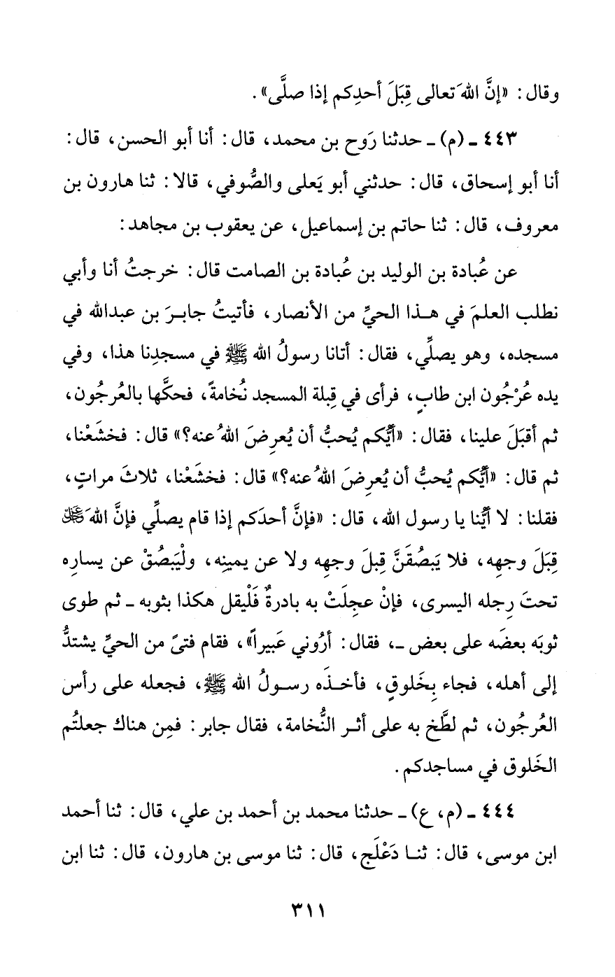 عن عبادة بن الوليد بن عبادة بن الصامت قال: خرجت أنا وأبي نطلب العلم في هذا الحي من الأنصار، فأتيت جابر بن عبد الله في مسجده، وهو يصلي، فقال: أتانا رسول الله صلى الله عليه وسلم في مسجدنا هذا، وفي يده عرجون ابن طاب، فرأى في قبلة المسجد نخامة، فحكها بالعرجون، ثم أقبل علينا، فقال: ((أيكم يحب أن يعرض الله عنه؟)) قال: فخشعنا، ثم قال: ((أيكم يحب أن يعرض الله عنه؟)) قال: فخشعنا، ثلاث مرات، فقلنا: لا أينا يا رسول الله، قال: ((فإن أحدكم إذا قام يصلي فإن الله عز وجل قبل وجهه، فلا يبصقن قبل وجهه و لا عن يمينه، وليبصق عن يساره تحت رجله اليسرى، فإن عجلت به بادرة فليقل هكذا بثوبه –ثم طوى ثوبه بعضه على بعض-، فقال: أروني عبيرا))، فقام فتى من الحي يشتد إلى أهله، فجاء بخلوق، فأخذه رسول الله صلى الله عليه وسلم فجعله على رأس العرجون، ثم لطخ به على أثر النخامة، فقال جابر: فمن هناك جعلتم الخلوق في مساجدكم.