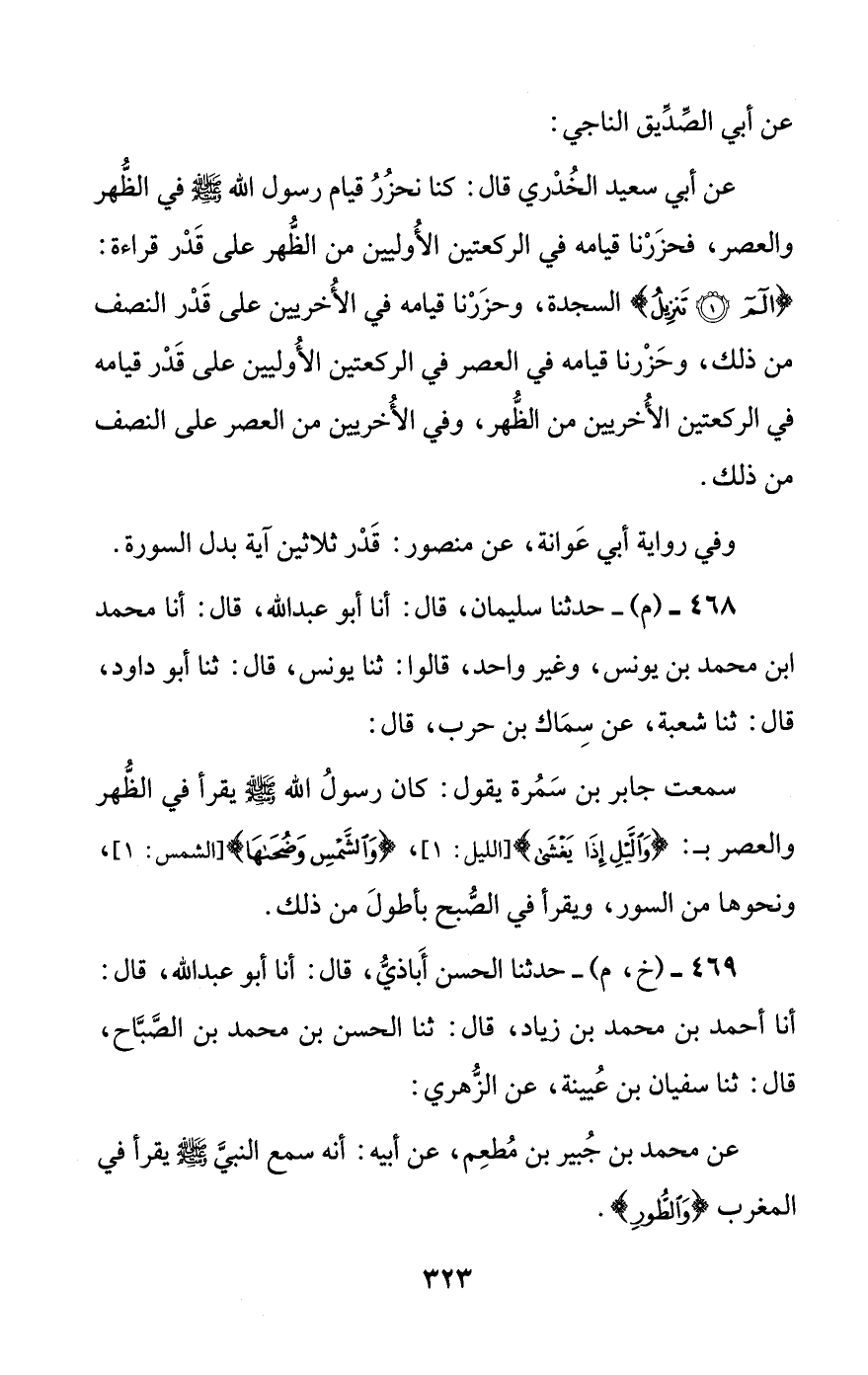 469 - (خ، م) - حدثنا الحسن أباذي، قال: أنا أبو عبد الله، قال: أنا أحمد بن محمد بن زياد، قال: ثنا الحسن بن محمد بن الصباح، قال: ثنا سفيان بن عيينة، عن الزهري: