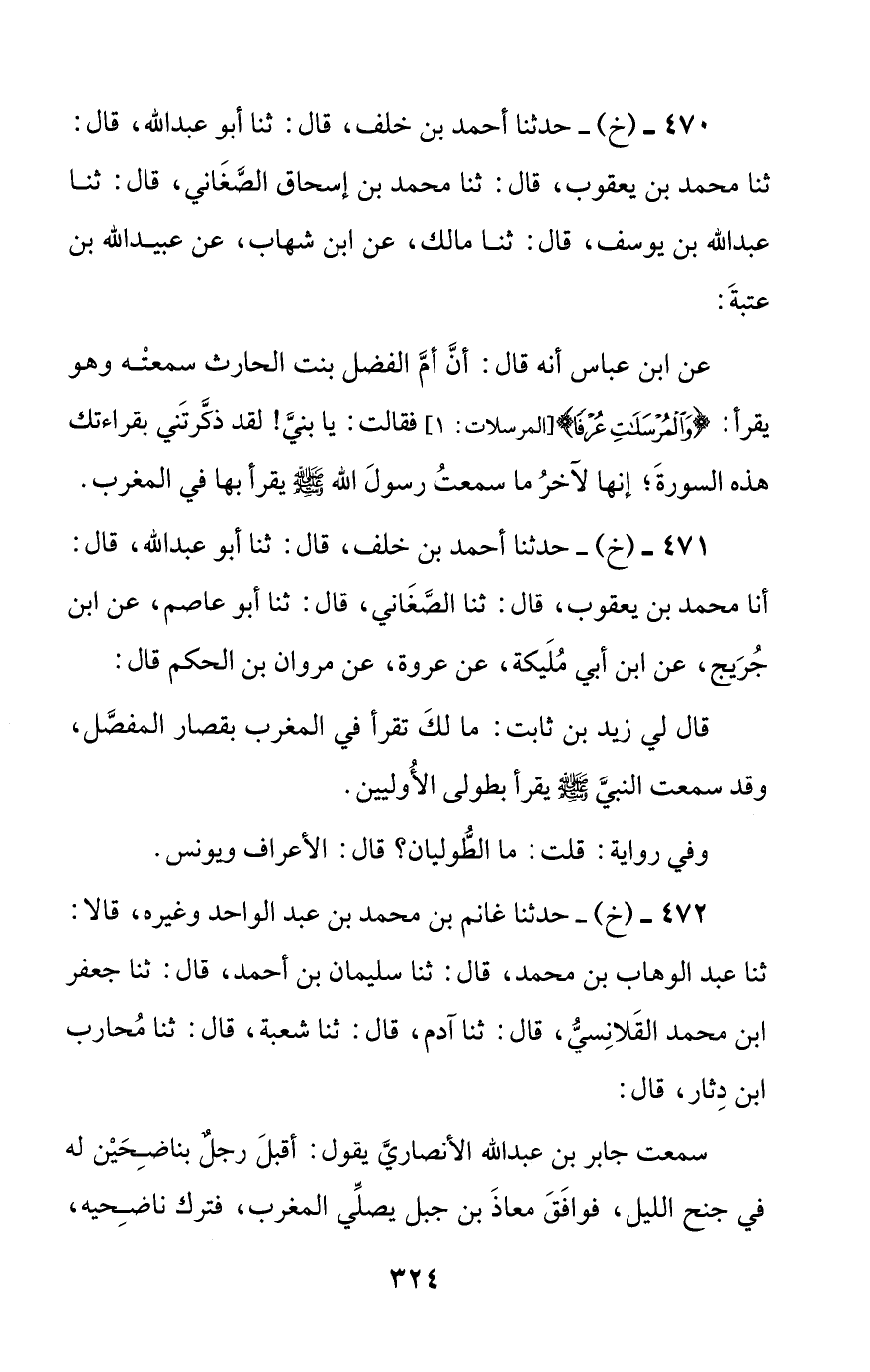 470 - (خ) - حدثنا أحمد بن خلف، قال: ثنا أبو عبد الله، قال: ثنا محمد بن يعقوب، قال: ثنا محمد بن إسحاق الصغاني، قال: ثنا عبد الله بن يوسف، قال: ثنا مالك، عن ابن شهاب، عن عبيد الله بن عتبة: