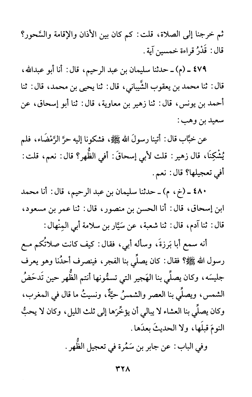 479 - (م) - حدثنا سليمان بن عبد الرحيم، قال: أنا أبو عبد الله، قال: ثنا محمد بن يعقوب الشيباني، قال: ثنا يحيى بن محمد، قال: ثنا أحمد بن يونس، قال: ثنا زهير بن معاوية، قال: ثنا أبو إسحاق، عن سعيد بن وهب: