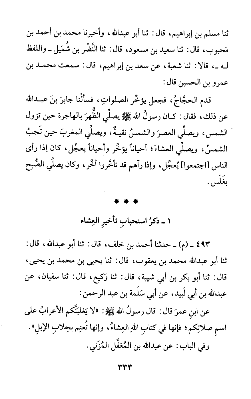 عن ابن عمر قال: قال رسول الله صلى الله عليه وسلم: ((لا يغلبنكم الأعراب على اسم صلاتكم؛ فإنها في كتاب الله العشاء، وإنها تعتم بحلاب الإبل)).