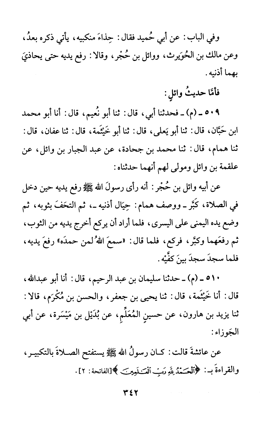 509 - (م) - فحدثنا أبي، قال: ثنا أبو نعيم، قال: أنا أبو محمد ابن حبان، قال: ثنا أبو يعلى، قال: ثنا أبو خيثمة، قال: ثنا عفان، قال: ثنا همام، قال: ثنا محمد بن جحادة، عن عبد الجبار بن وائل، عن علقمة بن وائل ومولى لهم أنهما حدثناه: