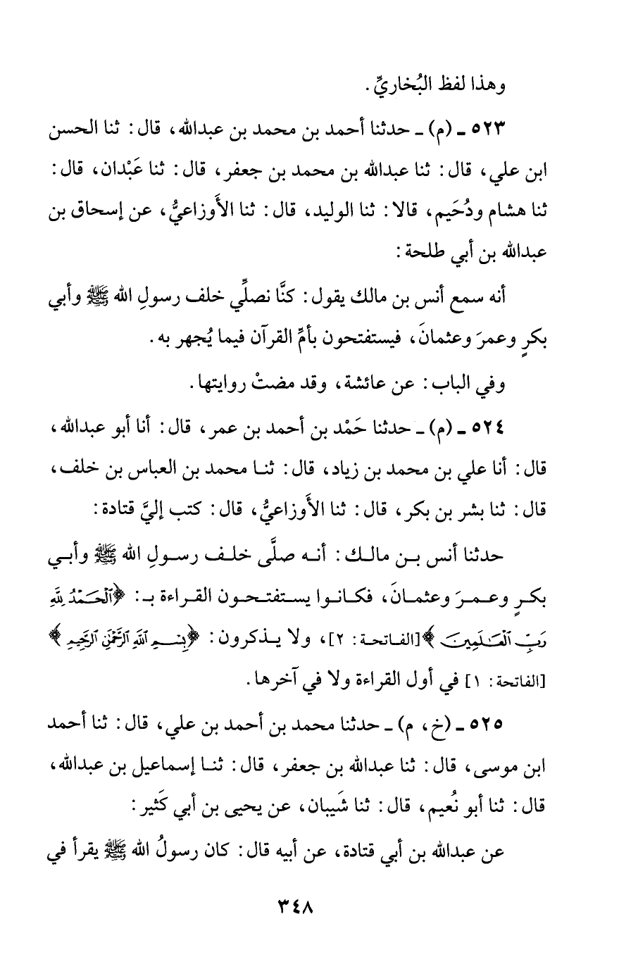 حدثنا أنس بن مالك: أنه صلى خلف رسول الله صلى الله عليه وسلم وأبي بكر وعمر وعثمان، فكانوا يستفتحون القرآءة بـ: {الحمد لله رب العالمين}، ولا يذكرون: {بسم الله الرحمن الرحيم} في أول القراءة ولا في آخرها.