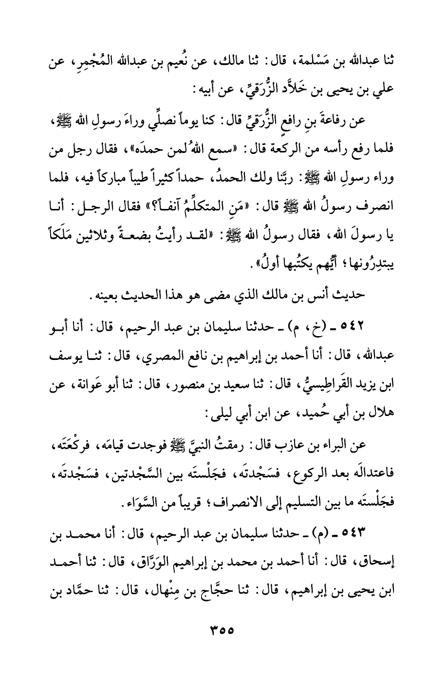 542 - (خ، م) - حدثنا سليمان بن عبد الرحيم، قال: أنا أبو عبد الله، قال: أنا أحمد بن إبراهيم بن نافع المصري، قال: ثنا يوسف بن يزيد القراطيسي، قال: ثنا سعيد بن منصور، قال: ثنا أبو عوانة، عن هلال بن أبي حميد، عن ابن أبي ليلى: