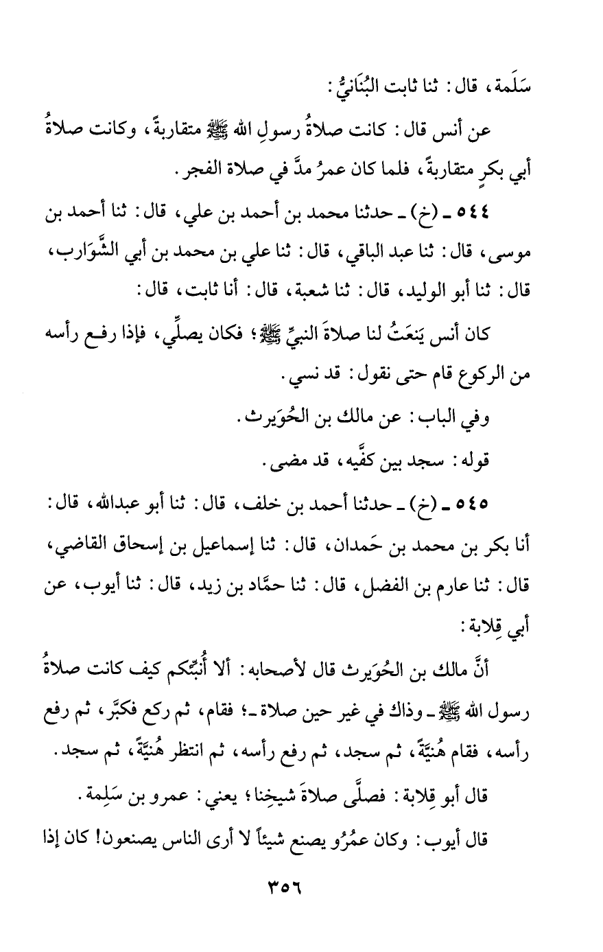 545 - (خ) - حدثنا أحمد بن خلف، قال: ثنا أبو عبد الله، قال: أنا بكر بن محمد بن حمدان، قال: ثنا إسماعيل بن إسحاق القاضي، قال: ثنا عارم بن الفضل، قال: ثنا حماد بن زيد، قال: ثنا أيوب، عن أبي قلابة: