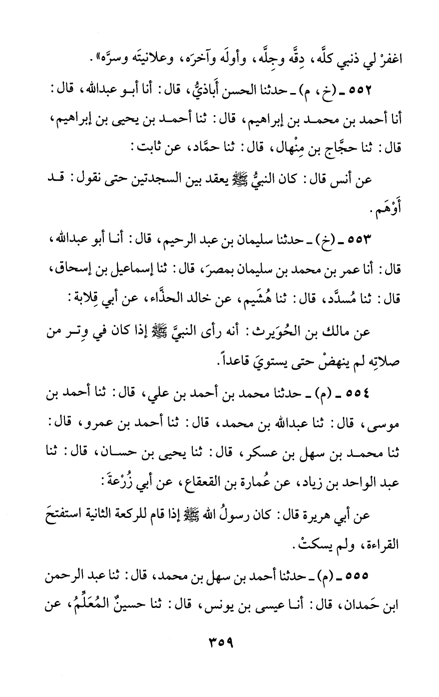 553 - (خ) - حدثنا سليمان بن عبد الرحيم، قال: أنا أبو عبد الله، قال: أنا عمر بن محمد بن سليمان بمصر، قال: ثنا إسماعيل بن إسحاق، قال: ثنا مسدد، قال: ثنا هشيم، عن خالد الحذاء، عن أبي قلابة: