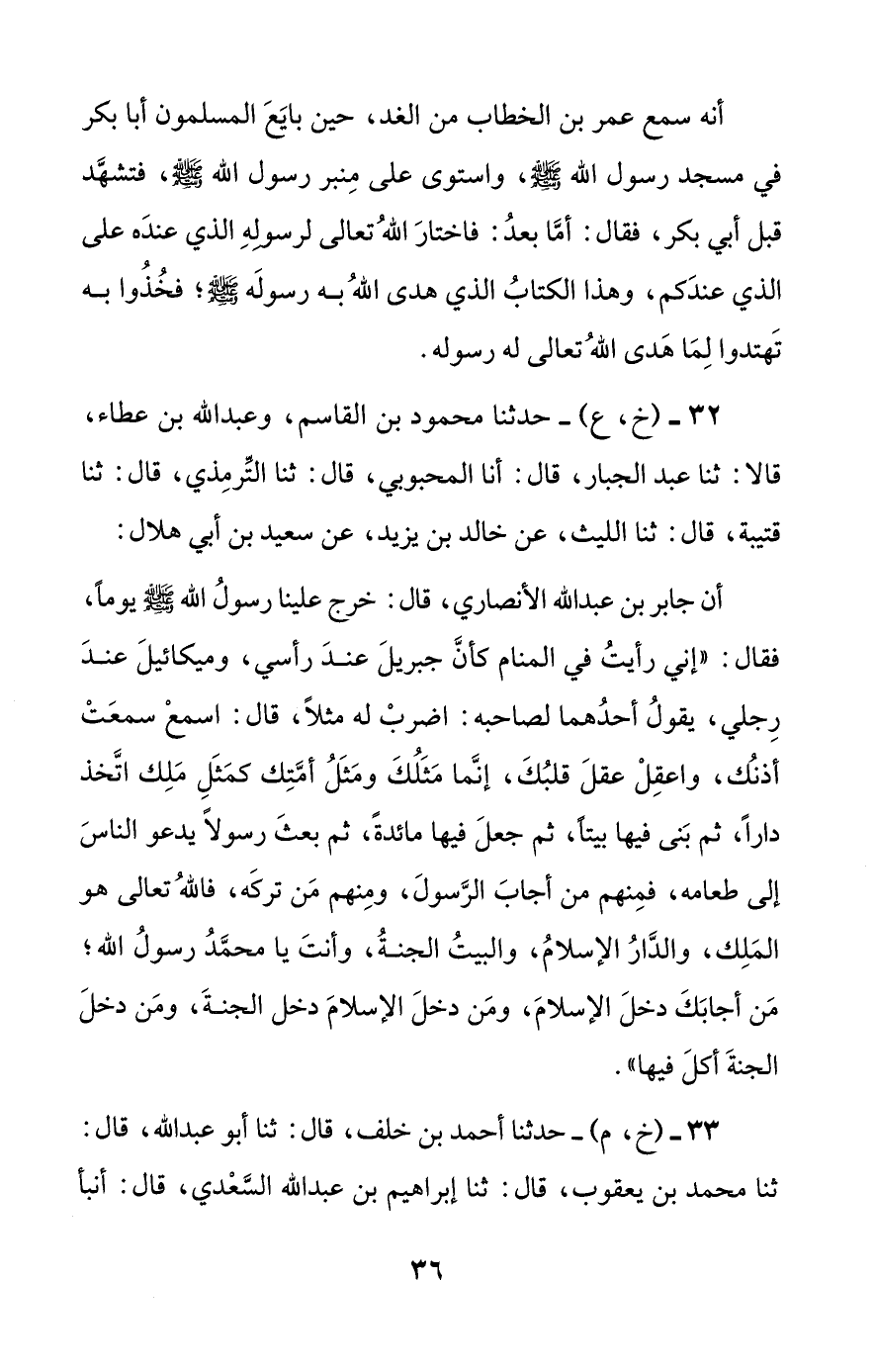 32 - (خ، ع) - حدثنا محمود بن القاسم، وعبد الله بن عطاء، قالا: ثنا عبد الجبار، قال: أنا المحبوبي، قال: ثنا الترمذي، قال: ثنا قتيبة، قال: ثنا الليث، عن خالد بن يزيد، عن سعيد بن أبي هلال: