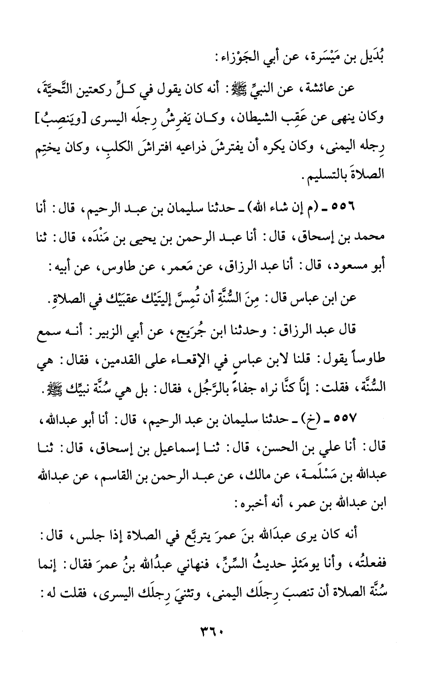 557 - (خ) - حدثنا سليمان بن عبد الرحيم، قال: أنا أبو عبد الله، قال: أنا علي بن الحسن، قال: ثنا إسماعيل بن إسحاق، قال: ثنا عبد الله بن مسلمة، عن مالك، عن عبد الرحمن بن القاسم، عن عبد الله بن عبد الله بن عمر، أنه أخبره: