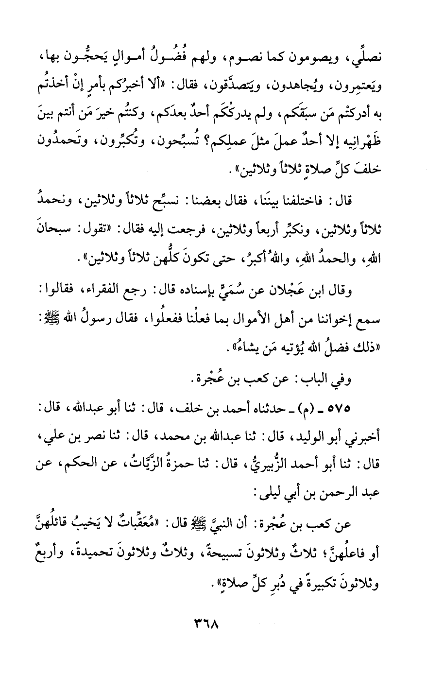 عن كعب بن عجرة: أن النبي صلى الله عليه وسلم قال: ((معقبات لا يخيب قائلهن أو فاعلهن؛ ثلاث وثلاثون تسبيحة، وثلاث وثلاثون تحميدة، وأربع وثلاثون تكبيرة في دبر كل صلاة)).