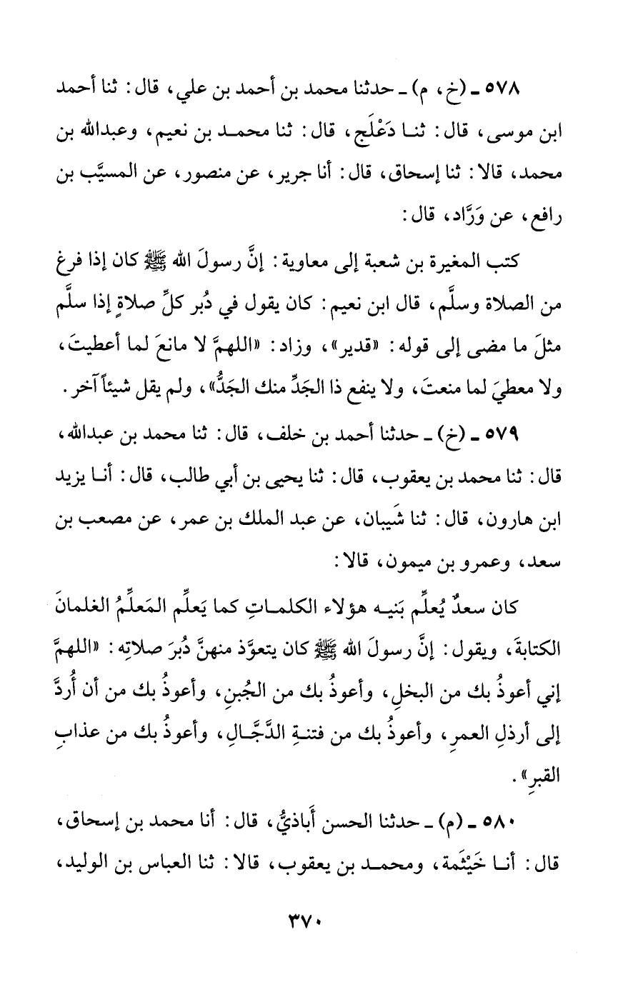 578 - (خ، م) - حدثنا محمد بن أحمد بن علي، قال: ثنا أحمد بن موسى، قال: ثنا دعلج، قال: ثنا محمد بن نعيم، وعبد الله بن محمد، قالا: ثنا إسحاق، قال: أنا جرير، عن منصور، عن المسيب بن رافع، عن وراد، قال: