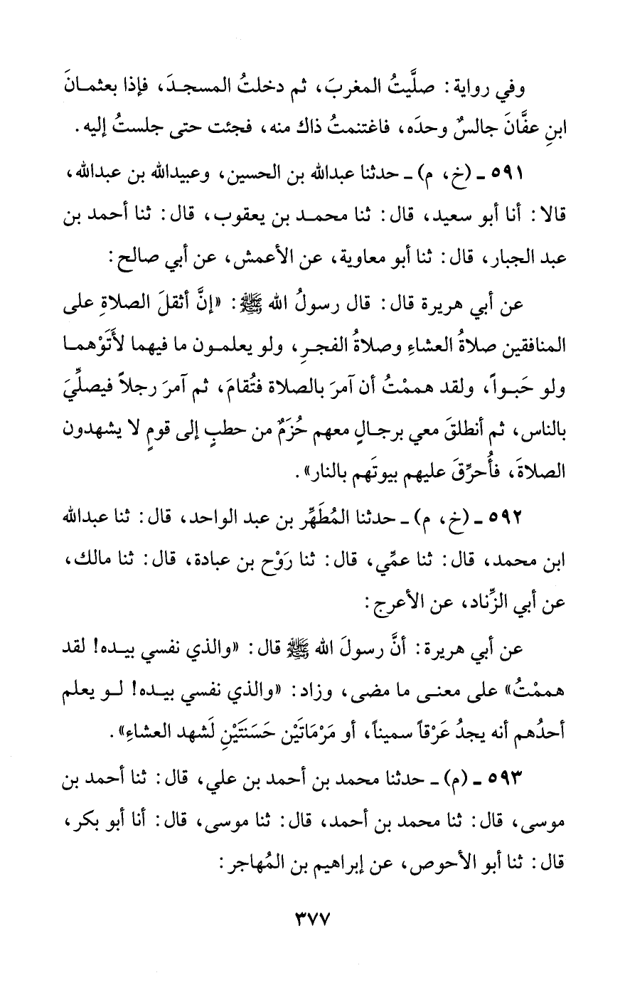592 - (خ، م) - حدثنا المطهر بن عبد الواحد، قال: ثنا عبد الله بن محمد، قال: ثنا عمي، قال: ثنا روح بن عبادة، قال: ثنا مالك، عن أبي الزناد، عن الأعرج: