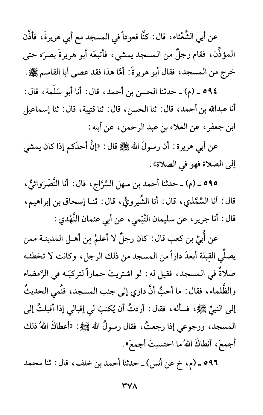 594 - (م) - حدثنا الحسن بن أحمد، قال: أنا أبو سلمة، قال: أنا عبد الله بن أحمد، قال: ثنا الحسن، قال: ثنا قتيبة، قال: ثنا إسماعيل بن جعفر، عن العلاء بن عبد الرحمن، عن أبيه: