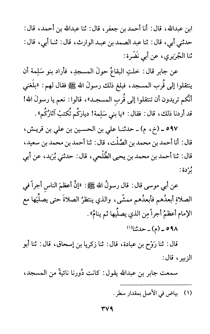 597 - (خ، م) - حدثنا علي بن الحسين بن علي بن قريش، قال: أنا أحمد بن محمد بن الصلت، قال: ثنا أحمد بن محمد بن سعيد، قال: ثنا أحمد بن محمد بن يحيى الطلحي، قال: حدثني بريد، عن أبي بردة: