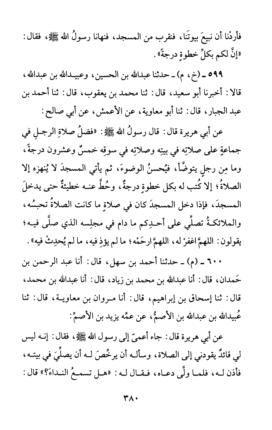 599 - (خ، م) - حدثنا عبد الله بن الحسين، وعبيد الله بن عبد الله، قالا: أخبرنا أبو سعيد، قال: ثنا محمد بن يعقوب، قال: ثنا أحمد بن عبد الجبار، قال: ثنا أبو معاوية، عن الأعمش، عن أبي صالح: