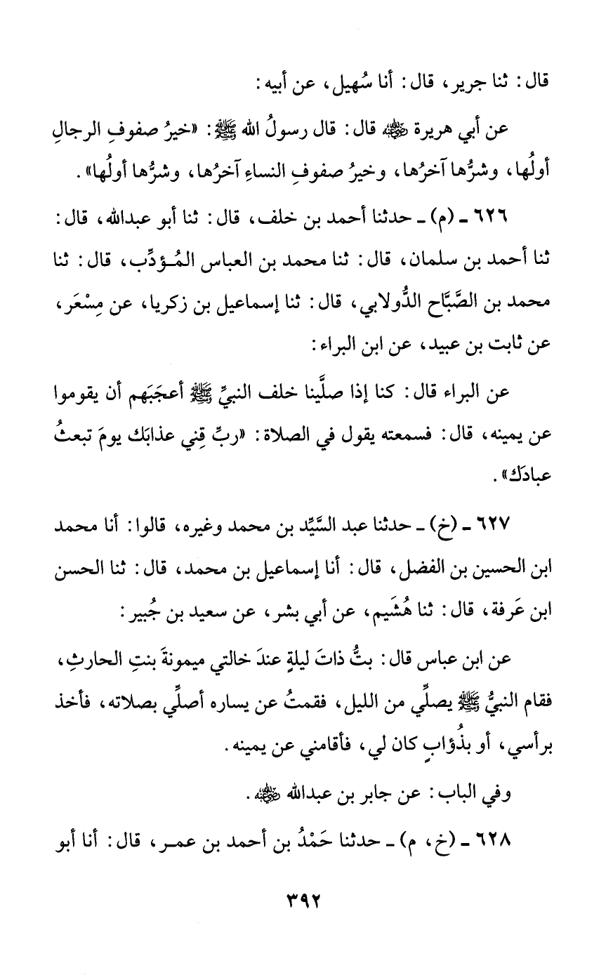 626 - (م) - حدثنا أحمد بن خلف، قال: ثنا أبو عبد الله، قال: ثنا أحمد بن سلمان، قال: ثنا محمد بن العباس المؤدب، قال: ثنا محمد بن الصباح الدولابي، قال: ثنا إسماعيل بن زكريا، عن مسعر، عن ثابت بن عبيد، عن ابن البراء: