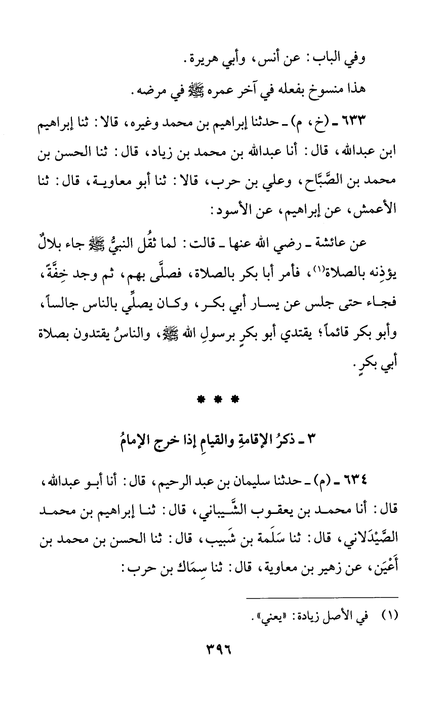 633 - (خ، م) - حدثنا إبراهيم بن محمد وغيره، قالا: ثنا إبراهيم ابن عبد الله، قال: أنا عبد الله بن محمد بن زياد، قال: ثنا الحسن بن محمد بن الصباح، وعلي بن حرب، قالا: ثنا أبو معاوية، قال: ثنا الأعمش، عن إبراهيم، عن الأسود: