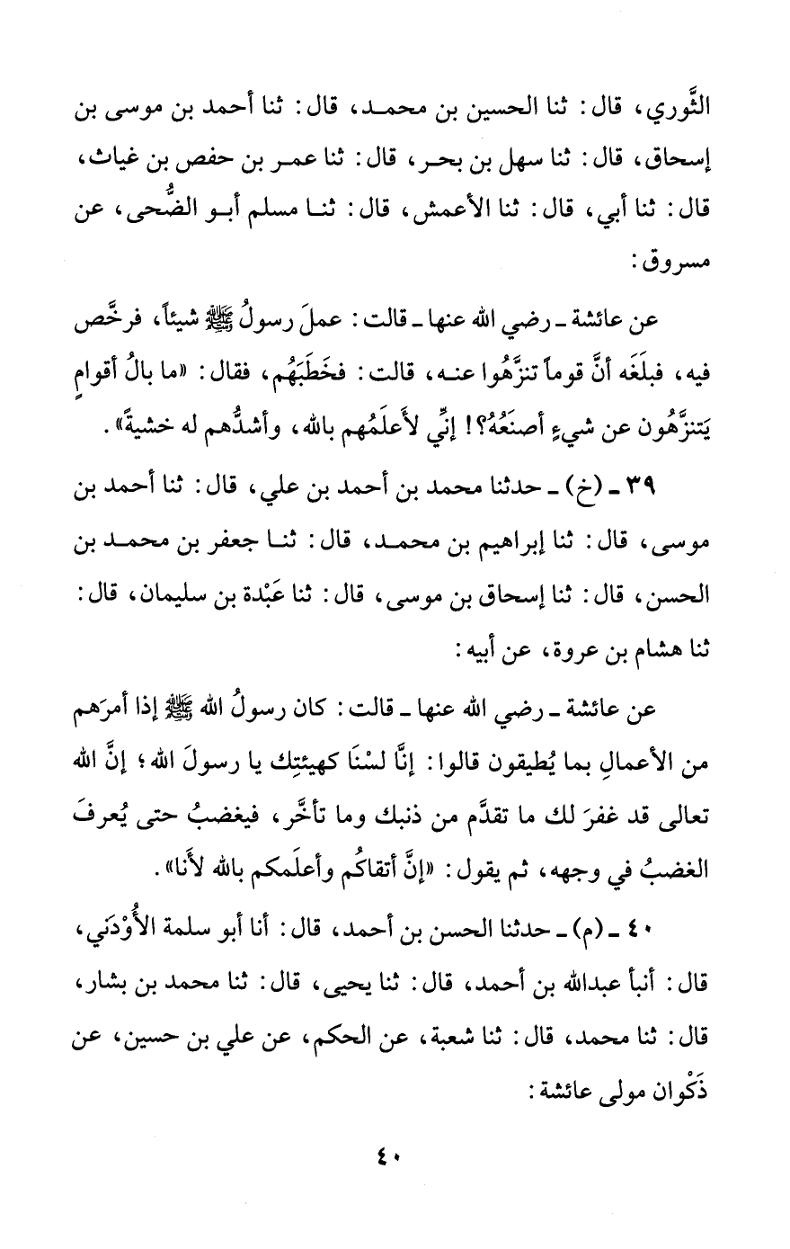 39 - (خ) - حدثنا محمد بن أحمد بن علي، قال: ثنا أحمد بن موسى، قال: ثنا إبراهيم بن محمد، قال: ثنا جعفر بن محمد بن الحسن، قال: ثنا إسحاق بن موسى، قال: ثنا عبدة بن سليمان، قال: ثنا هشام بن عروة، عن أبيه: