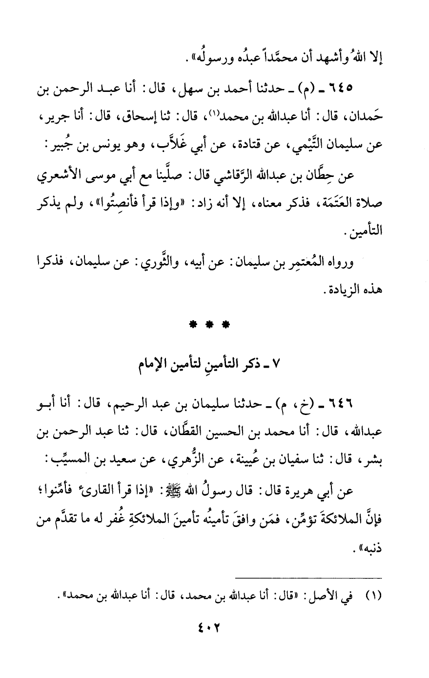 عن حطان بن عبد الله الرقاشي قال: صلينا مع أبي موسى الأشعري صلاة العتمة، فذكر معناه، إلا أنه زاد: ((وإذا قرأ فأنصتوا))، ولم يذكر التأمين.