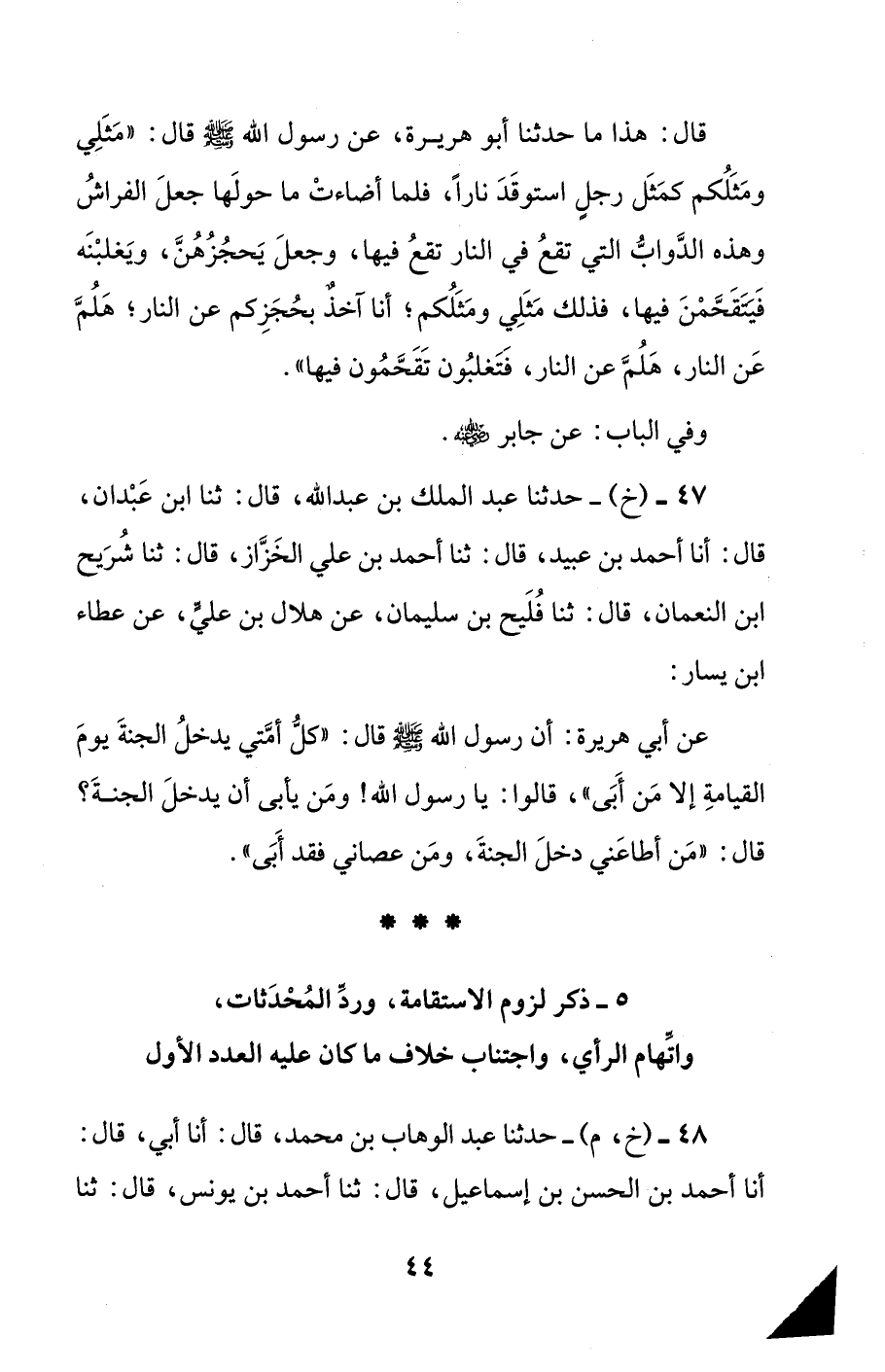 [5] ذكر لزوم الاستقامة، ورد المحدثات، واتهام الرأي، واجتناب خلاف ما كان عليه العدد الأول