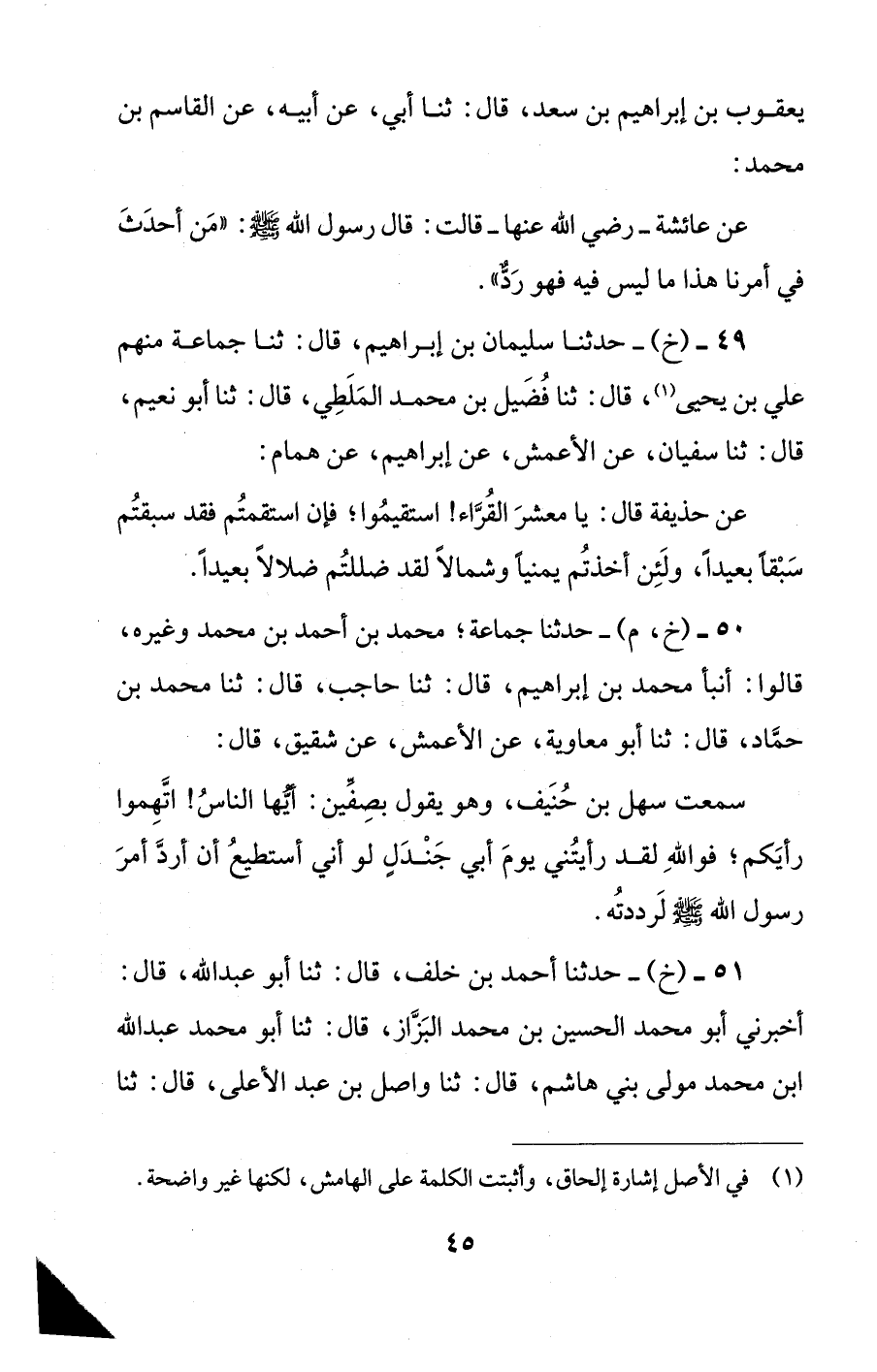 49 - (خ) - حدثنا سليمان بن إبراهيم، قال: ثنا جماعة منهم علي بن يحيى، قال: ثنا فضيل بن محمد الملطي، قال: ثنا أبو نعيم، قال: ثنا سفيان، عن الأعمش، عن إبراهيم، عن همام: