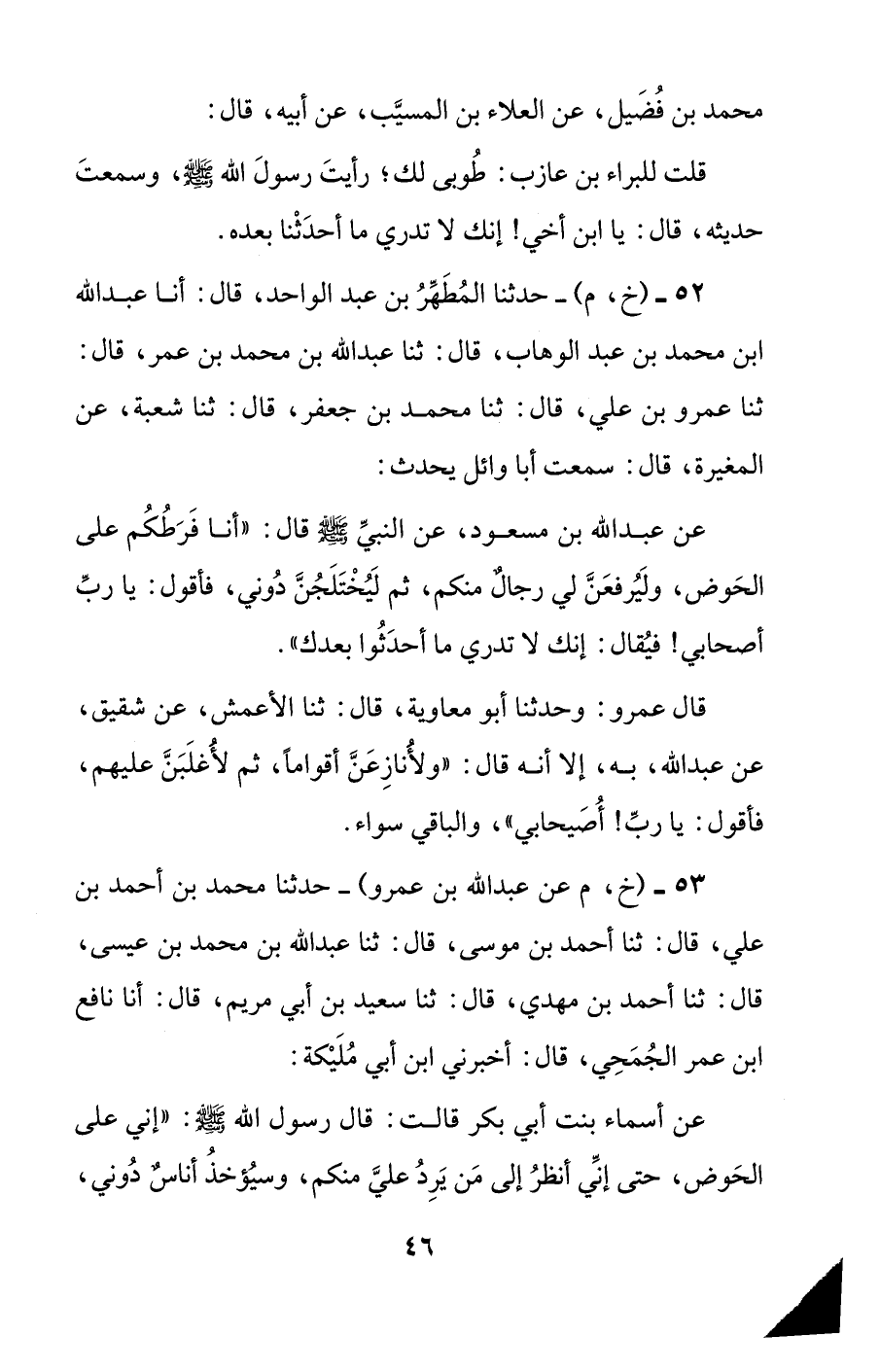 52 - (خ، م) - حدثنا المطهر بن عبد الواحد، قال: أنا عبد الله بن محمد بن عبد الوهاب، قال: ثنا عبد الله بن محمد بن عمر، قال: ثنا عمرو بن علي، قال: ثنا محمد بن جعفر، قال: ثنا شعبة، عن المغيرة، قال: سمعت أبا وائل يحدث: