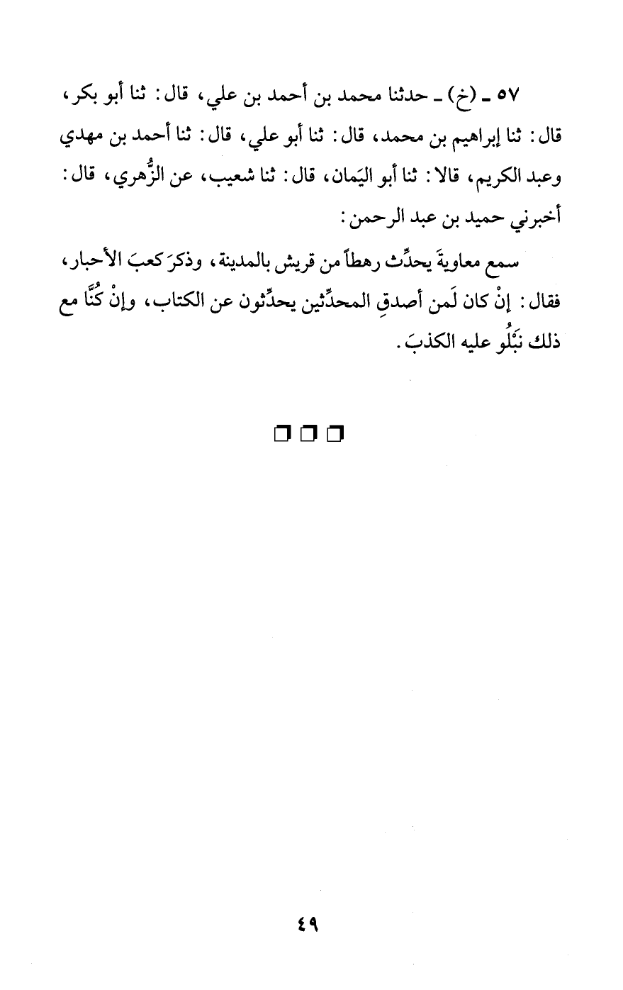 57 - (خ) - حدثنا محمد بن أحمد بن علي، قال: ثنا أبو بكر، قال: ثنا إبراهيم بن محمد، قال: ثنا أبو علي، قال: ثنا أحمد بن مهدي وعبد الكريم، قالا: ثنا أبو اليمان، قال: ثنا شعيب، عن الزهري، قال: أخبرني حميد بن عبد الرحمن: