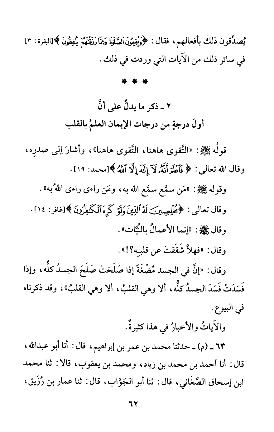 [2] ذكر ما يدل على أن أول درجة من درجات الإيمان العلم بالقلب