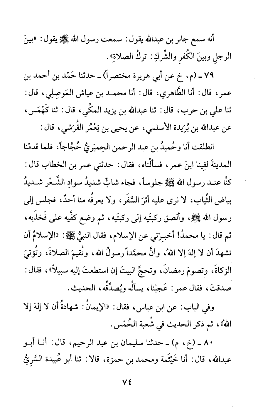 انطلقت أنا وحميد بن عبد الرحمن الحميري حجاجا، فلما قدمنا المدينة لقينا ابن عمر، فسألناه، فقال: حدثني عمر بن الخطاب قال: كنا عند رسول الله صلى الله عليه وسلم جلوسا، فجاء شاب شديد سواد الشعر شديد بياض الثياب، لا نرى عليه أثر السفر، ولا يعرفه منا أحد، فجلس إلى رسول الله صلى الله عليه وسلم، وألصق ركبتيه إلى ركبتيه، ثم وضع كفيه على فخذيه، ثم قال: يا محمد! أخبرني عن الإسلام، فقال النبي صلى الله عليه وسلم: ((الإسلام أن تشهد أن لا إله إلا الله، وأن محمدا رسول الله، وتقيم الصلاة، وتؤتي الزكاة، وتصوم رمضان، وتحج البيت إن استطعت إليه سبيلا))، فقال: صدقت، فقال عمر: عجبنا، يسأله ويصدقه، الحديث.