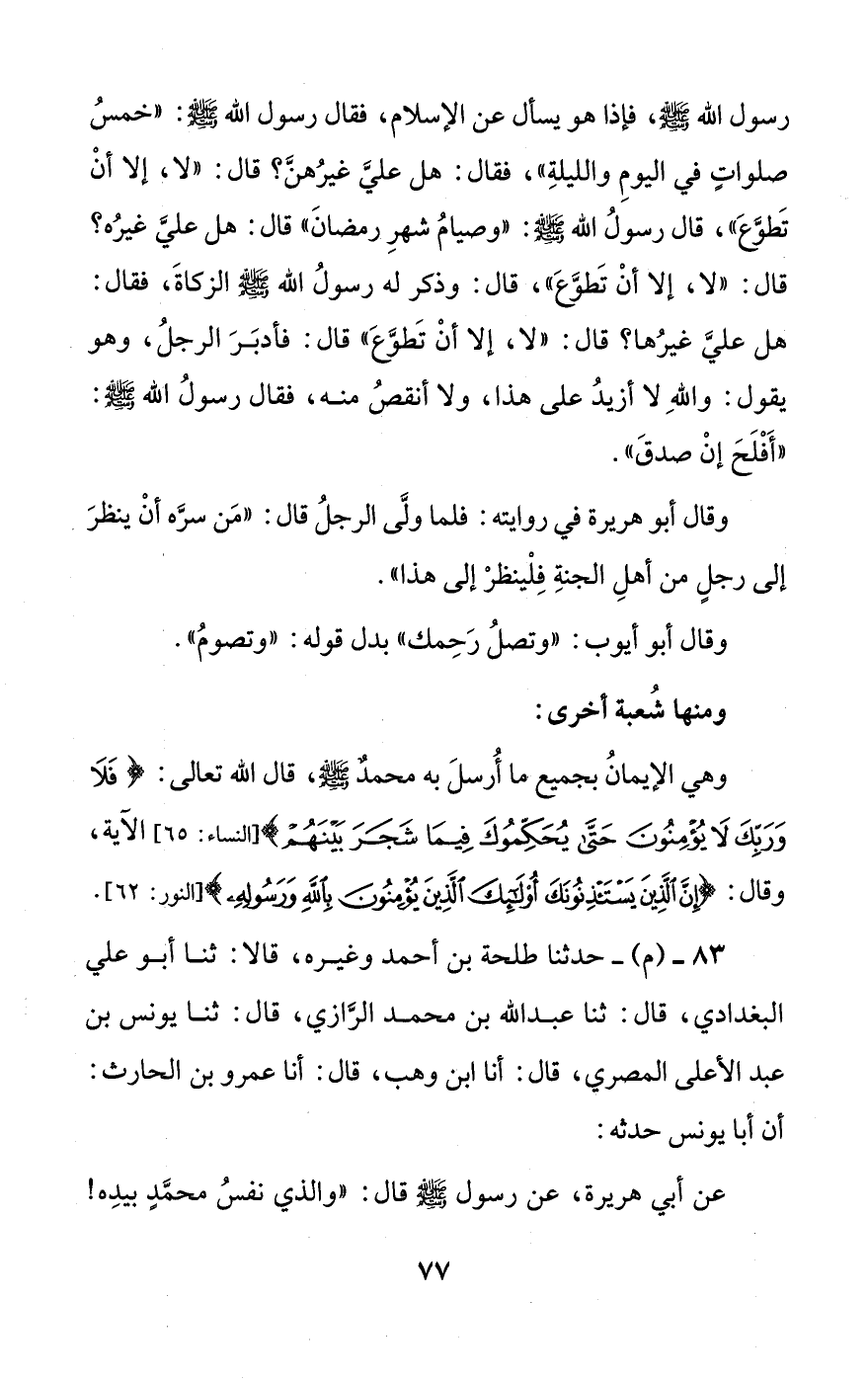 83 - (م) - حدثنا طلحة بن أحمد وغيره، قالا: ثنا أبو علي البغدادي، قال: ثنا عبد الله بن محمد الرازي، قال: ثنا يونس بن عبد الأعلى المصري، قال: أنا ابن وهب، قال: أنا عمرو بن الحارث: أن أبا يونس حدثه: