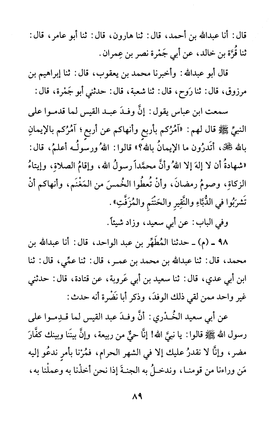 عن أبي سعيد الخدري: أن وفد عبد القيس لما قدموا على رسول الله صلى الله عليه وسلم قالوا: يا نبي الله! إنا حي من ربيعة، وإن بيننا وبينك كفار مضر، وإنا لا نقدر عليك إلا في الشهر الحرام، فمرنا بأمر ندعو إليه من وراءنا من قومنا، وندخل به الجنة إذا نحن أخذنا به وعملنا به، #90# فذكر معناه سواء؛ إلا أنه قال: ((أن تعبدوا الله ولا تشركوا به شيئا)) بدل الشهادتين.