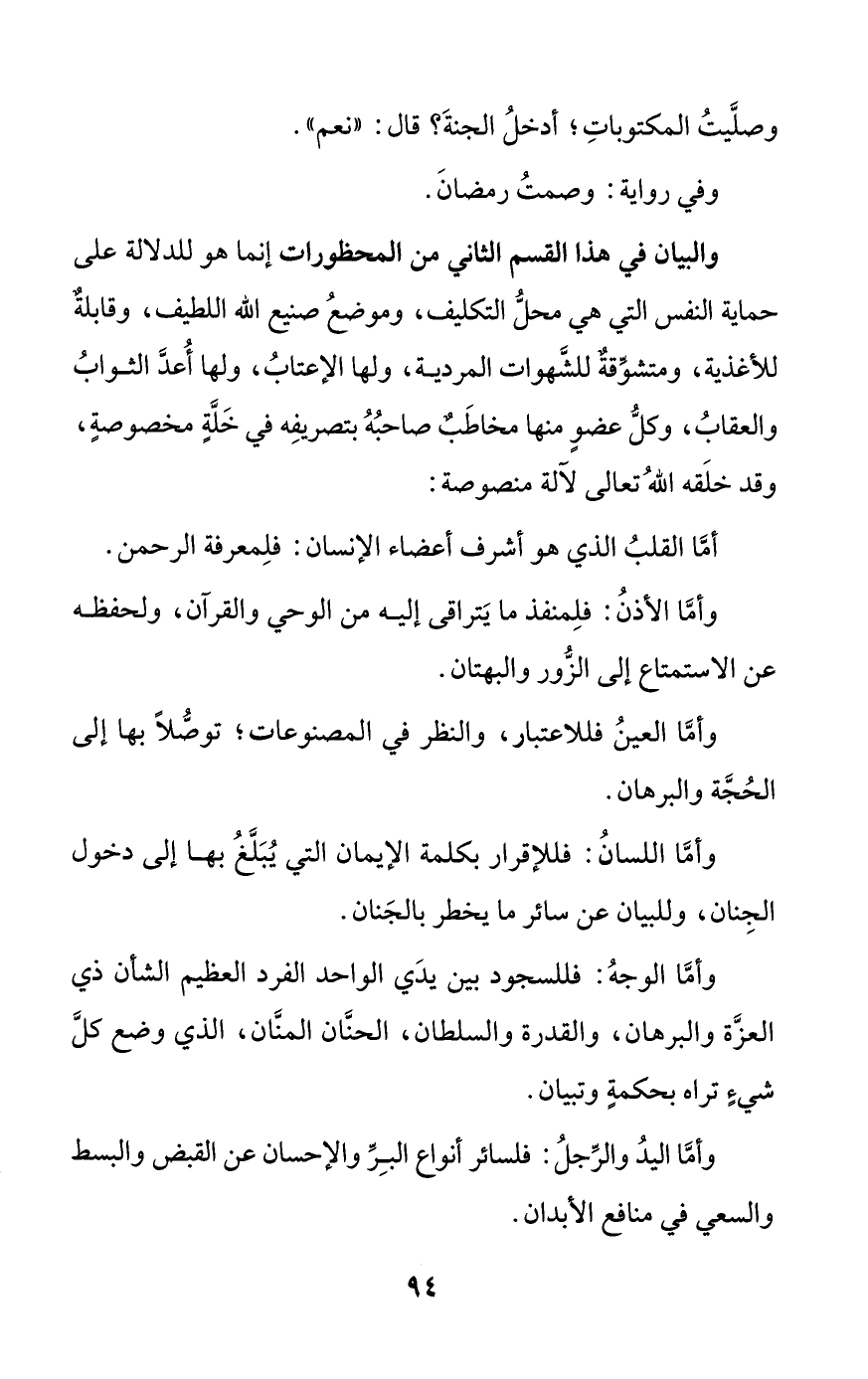 والبيان في هذا القسم الثاني من المحظورات إنما هو للدلالة على حماية النفس التي هي محل التكليف، وموضع صنيع الله اللطيف، وقابلة للأغذية، ومتشوقة للشهوات المردية، ولها الإعتاب، ولها أعد الثواب والعقاب، وكل عضو منها مخاطب صاحبه بتصريفه في خلة مخصوصة، وقد خلقه الله تعالى لآلة منصوصة: