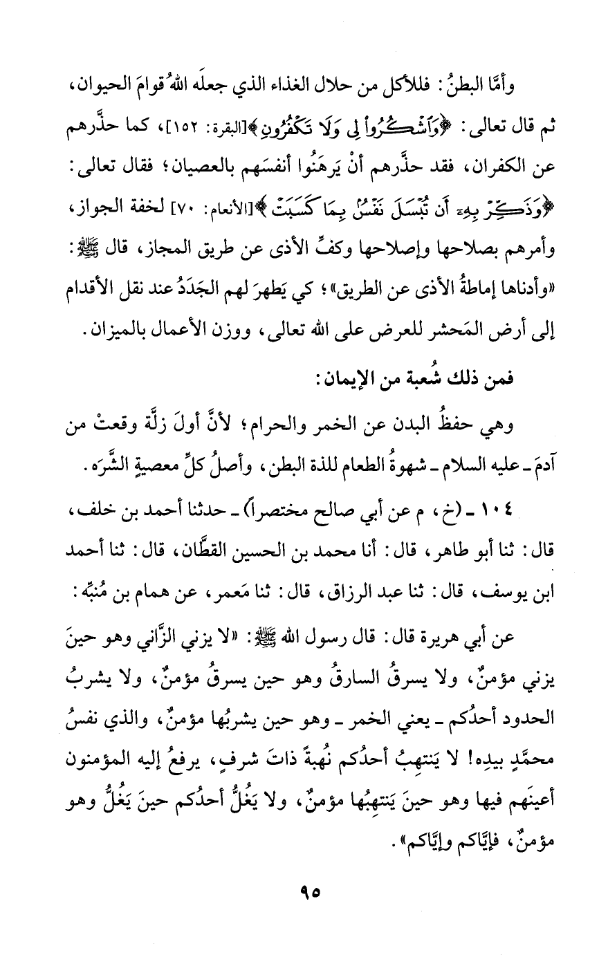عن أبي هريرة قال: قال رسول الله صلى الله عليه وسلم: ((لا يزني الزاني وهو حين يزني مؤمن، ولا يسرق السارق وهو حين يسرق مؤمن، ولا يشرب الحدود أحدكم -يعني الخمر- وهو حين يشربها مؤمن، والذي نفس محمد بيده! لا ينتهب أحدكم نهبة ذات شرف، يرفع إليه المؤمنون أعينهم فيها وهو حين ينتهبها مؤمن، ولا يغل أحدكم حين يغل وهو مؤمن، فإياكم وإياكم)).