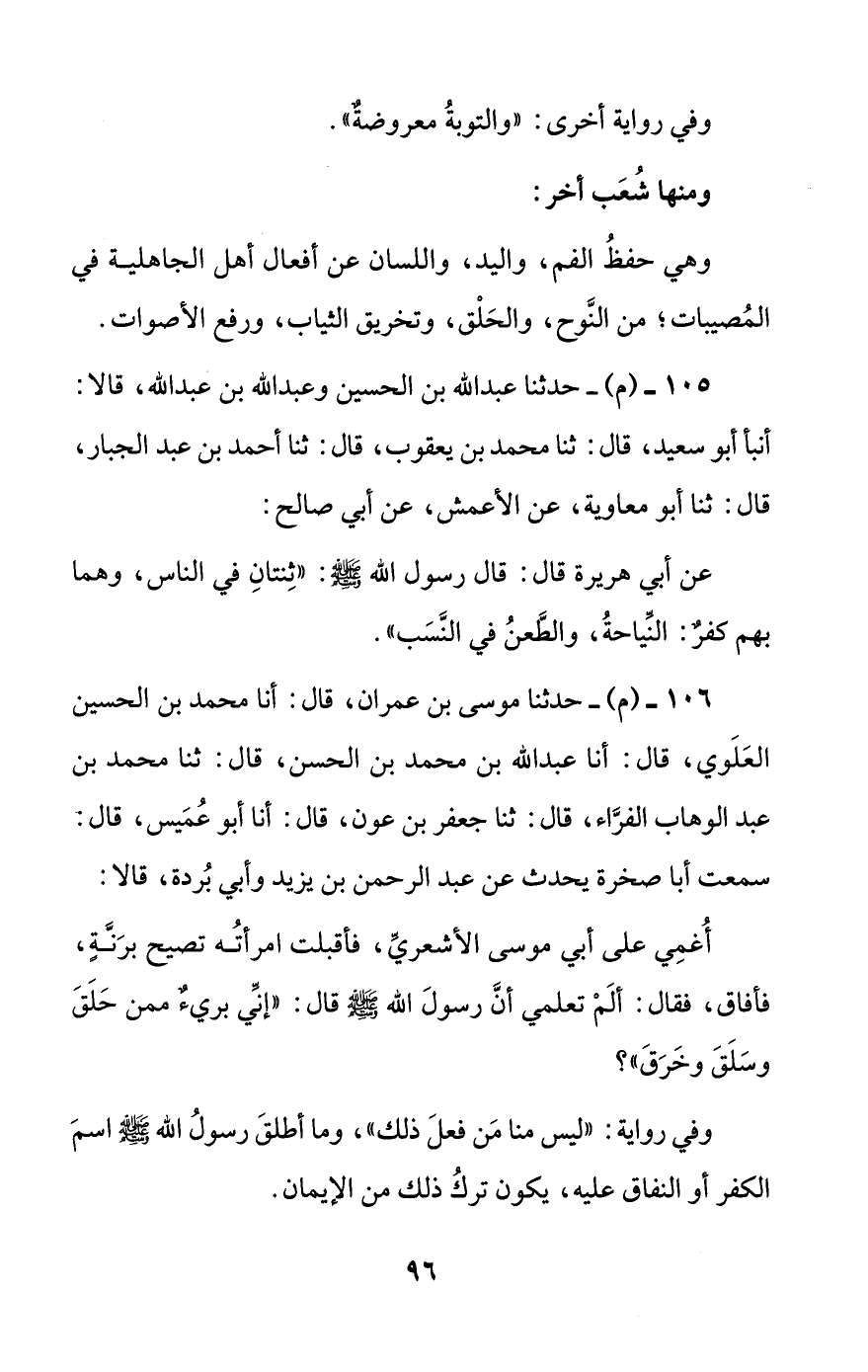 106 - (م) - حدثنا موسى بن عمران، قال: أنا محمد بن الحسين العلوي، قال: أنا عبد الله بن محمد بن الحسن، قال: ثنا محمد بن عبد الوهاب الفراء، قال: ثنا جعفر بن عون، قال: أنا أبو عميس، قال: سمعت أبا صخرة يحدث عن عبد الرحمن بن يزيد وأبي بردة، قالا: