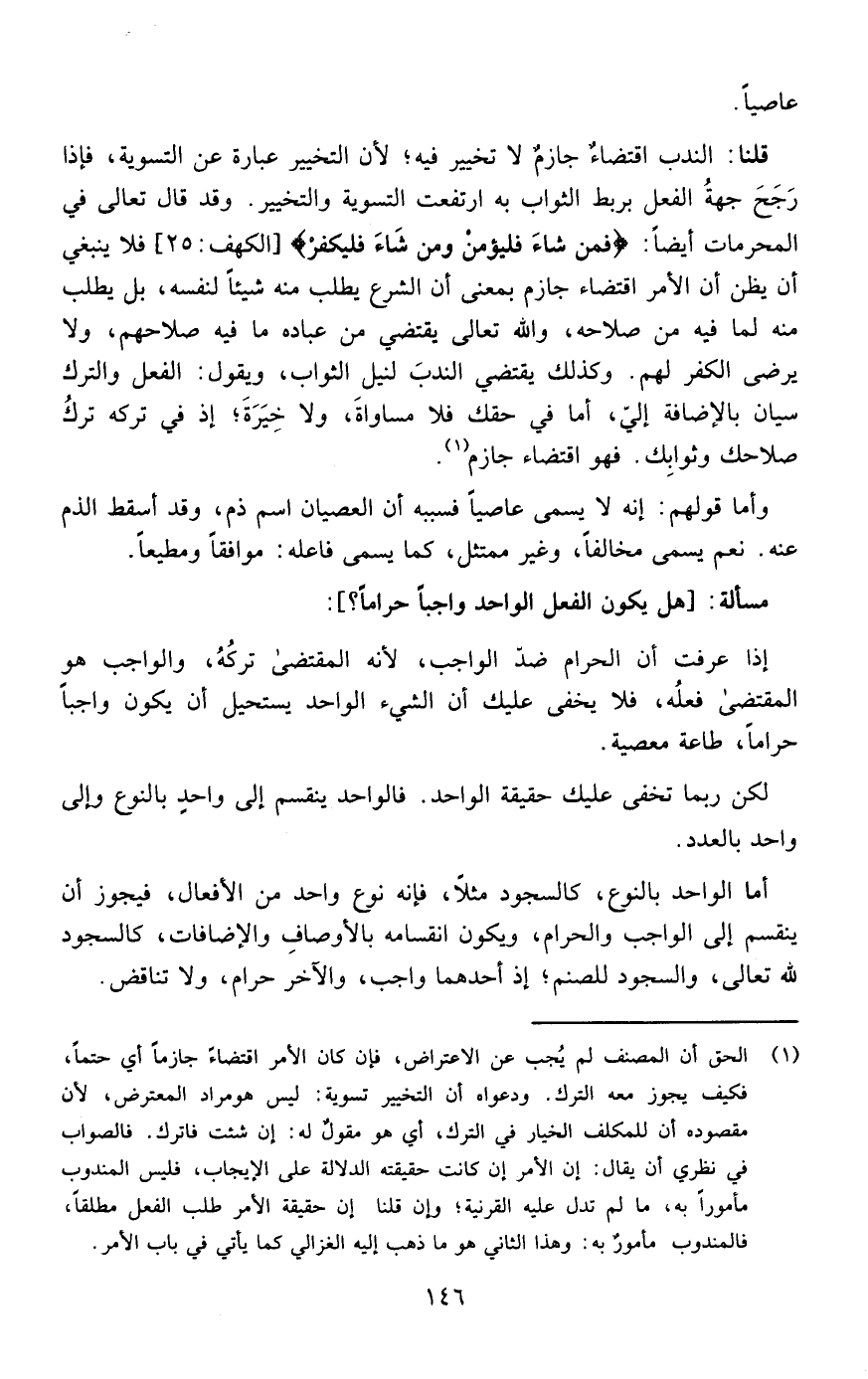 وأما قولهم: أنه لا يسمى عاصيا فسببه أن العصيان اسم ذم وقد أسقط الذم عنه نعم يسمى مخالفا وغير ممتثل كما يسمى فاعله موافقا ومطيعا