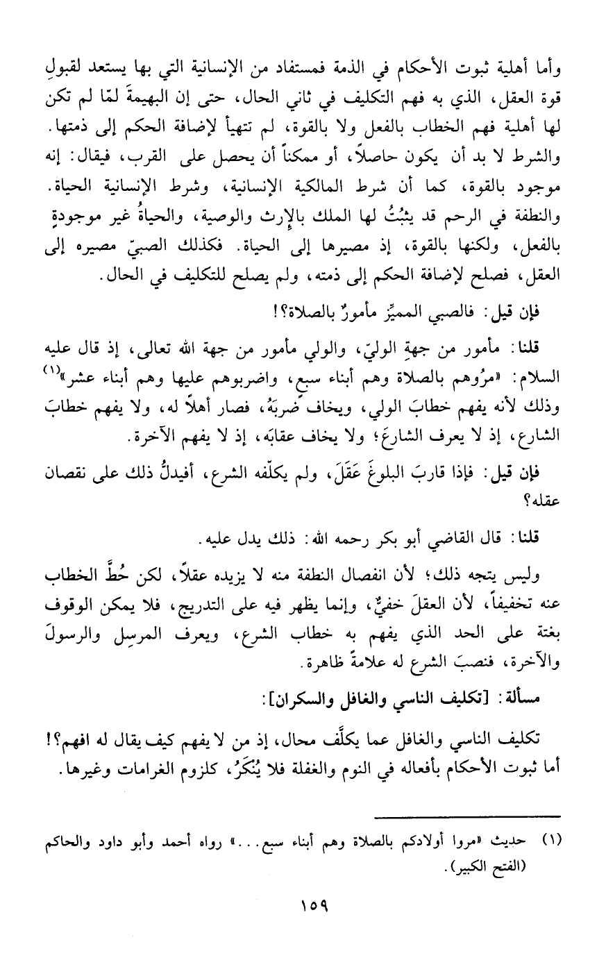 قلنا: قال القاضي أبو بكر رحمه الله ذلك يدل عليه وليس يتجه ذلك لأن انفصال النطفة منه لا يزيده عقلا لكن حط الخطاب عنه تخفيفا لأن العقل خفي وإنما يظهر فيه على التدريج فلا يمكن الوقوف بغتة على الحد الذي يفهم به خطاب الشرع ويعرف المرسل والرسول والآخرة فنصب الشرع له علامة ظاهرة