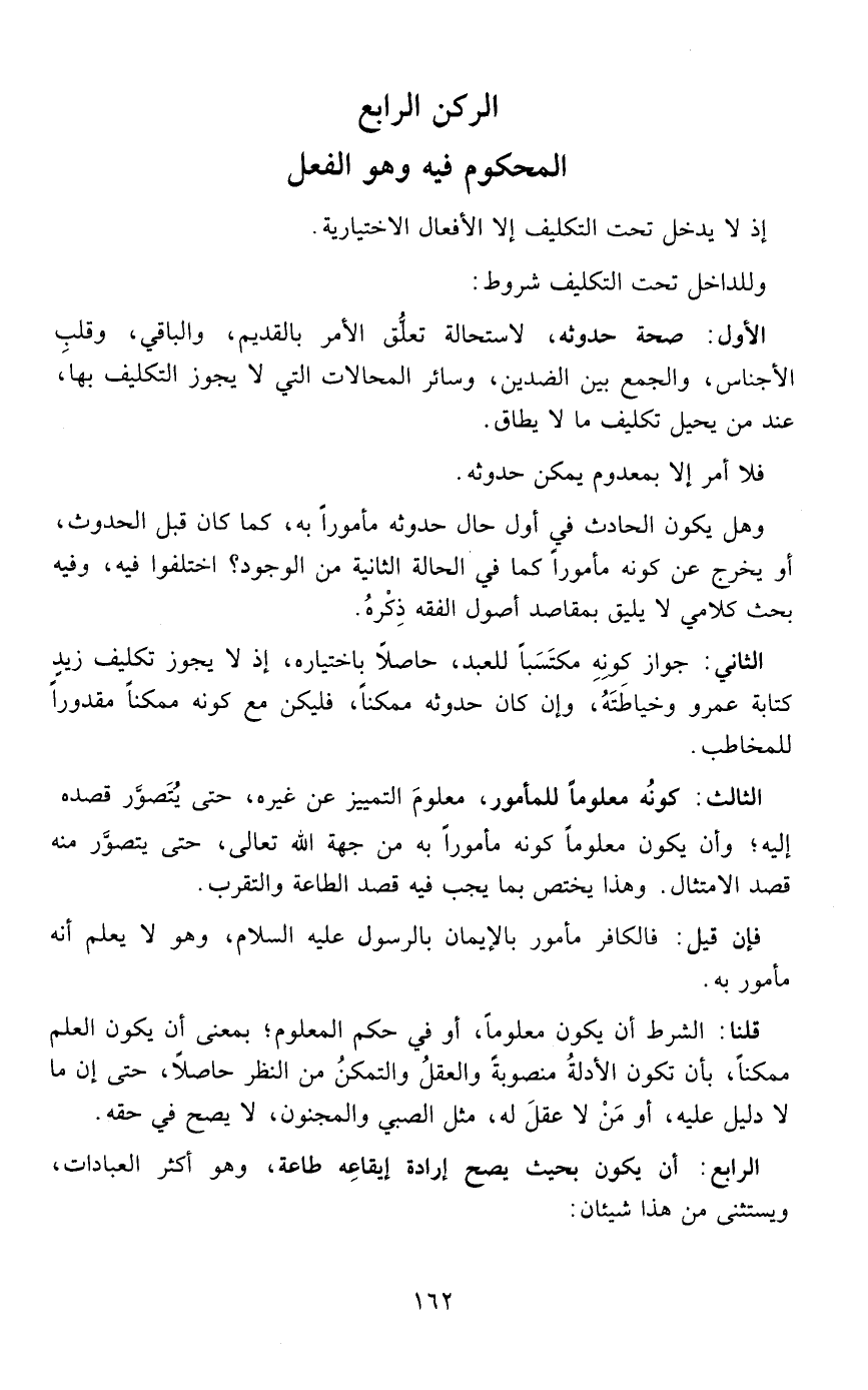 ا لأول صحة حدوثه لاستحالة تعلق الأمر بالقديم والباقي وقلب الأجناس والجمع بين الضدين وسائر المحالات التي لا يجوز التكليف بها عند من يحيل تكليف ما لا يطاق