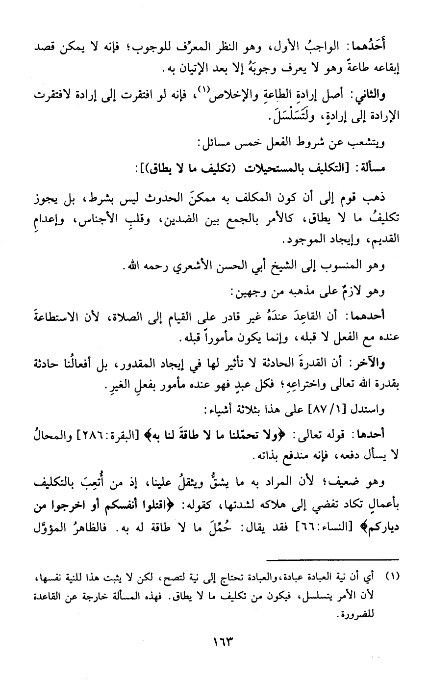 والثاني: أصل إرادة الطاعة والإخلاص فإنه لو افتقرت إلى إرادة لافتقرت الإرادة إلى إرادة ولتسلسل ويتشعب عن شروط الفعل خمس مسائل