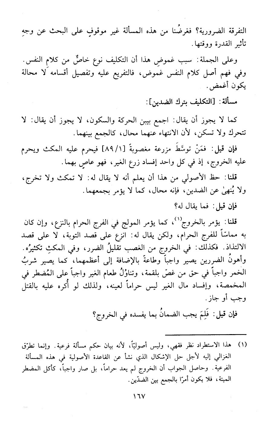 قلنا: حظ الأصولي من هذا أن يعلم أنه لا يقال له لا تمكث ولا تخرج ولا ينهى عن الضدين فإنه محال كما لا يؤمر بجمعهما