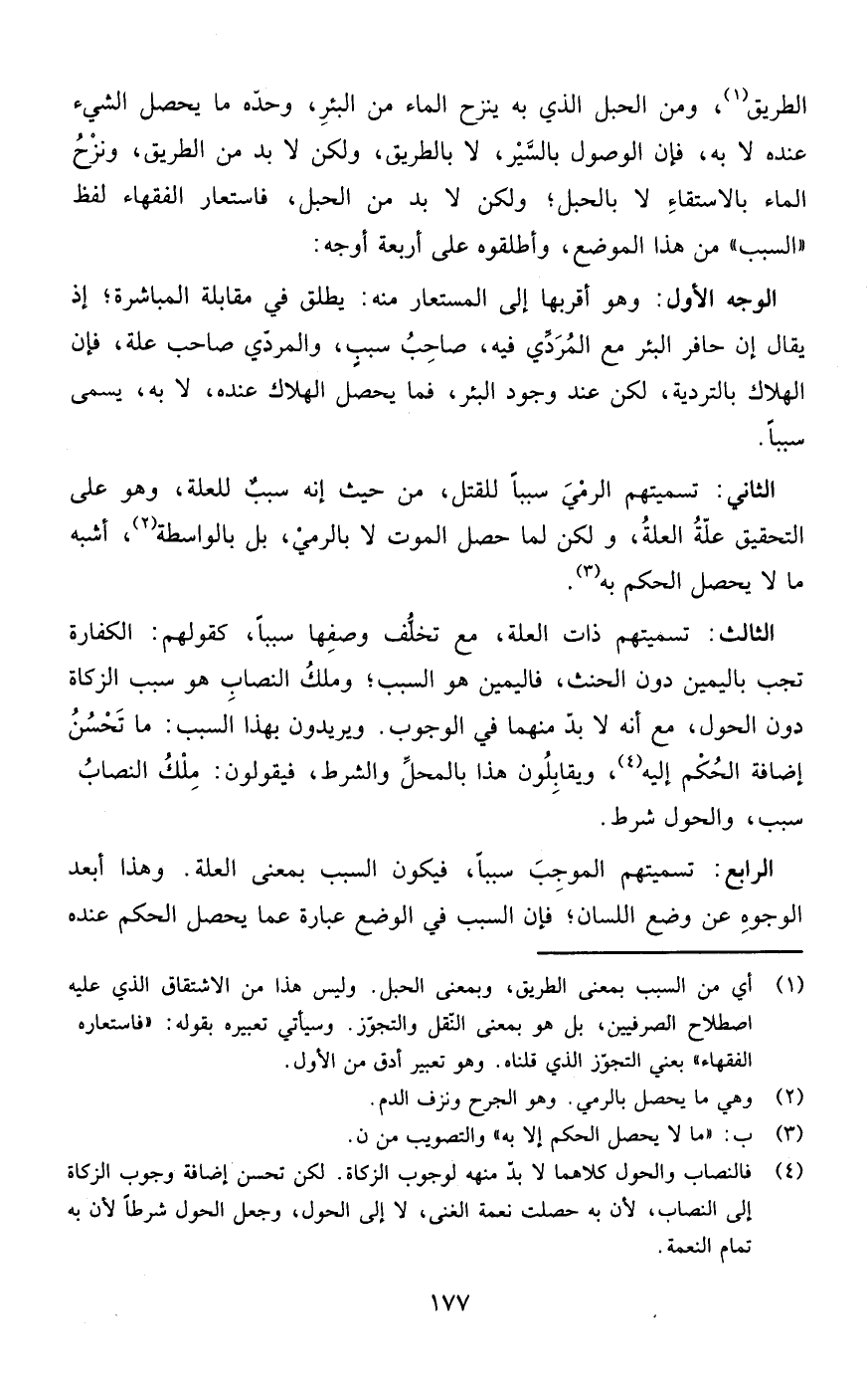 الطريق ومن الحبل الذي به ينزح الماء من البئر وحده ما يحصل الشيء عنده لا به فإن الوصول بالسير لا بالطريق ولكن لا بد من الطريق ونزح الماء بالاستقاء لا بالحبل ولكن لا بد من الحبل فاستعار الفقهاء لفظ السبب من هذا الموضع وأطلقوه على أربعة أوجه: