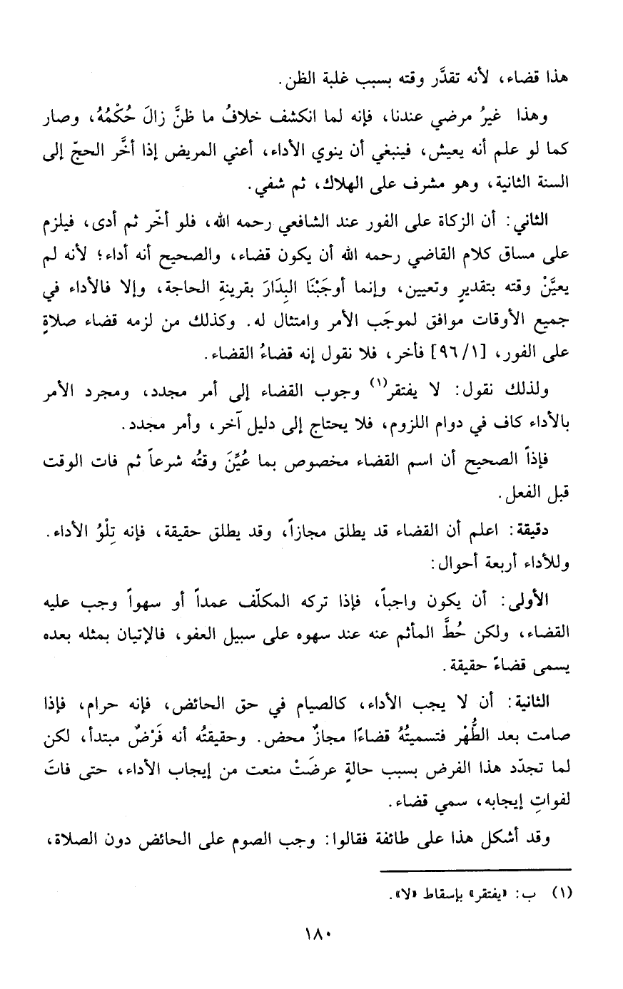 دقيقة: أعلم أن القضاء قد يطلق مجازا وقد يطلق حقيقة فإنه تلو الأداء وللأداء أربعة أحوال