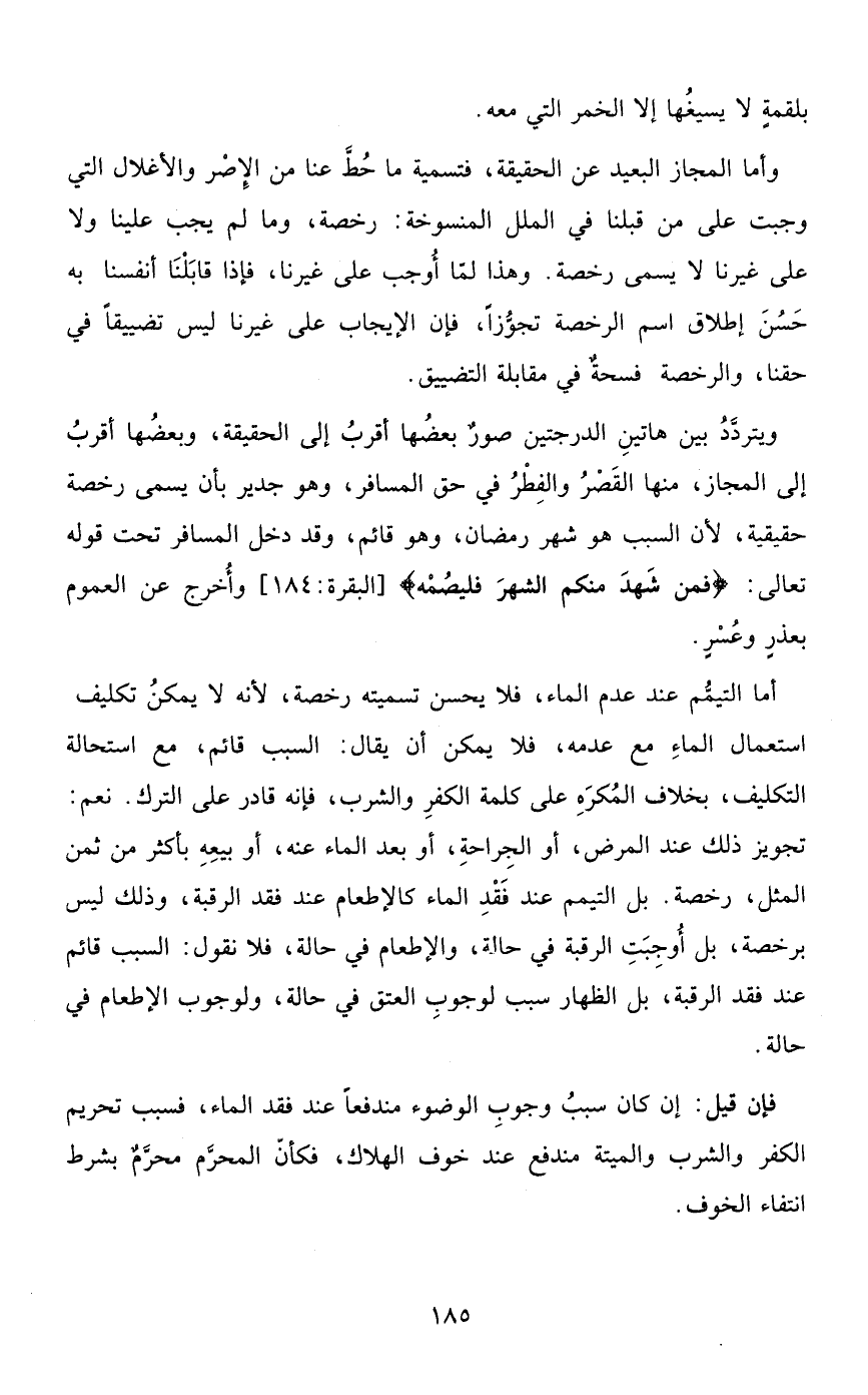 ويتردد بين هاتين الدرجتين صور بعضها أقرب إلى الحقيقة وبعضها أقرب إلى المجاز منها القصر والفطر في حق المسافر وهو جدير بأن يسمى رخصة حقيقة لأن السبب هو شهر رمضان وهو قائم وقد دخل المسافر تحت قوله تعالى :{ فَمَنْ شَهِدَ مِنْكُمُ الشَّهْرَ فَلْيَصُمْهُ } [البقرة184] وأخرج عن العموم بعذر وعسر
