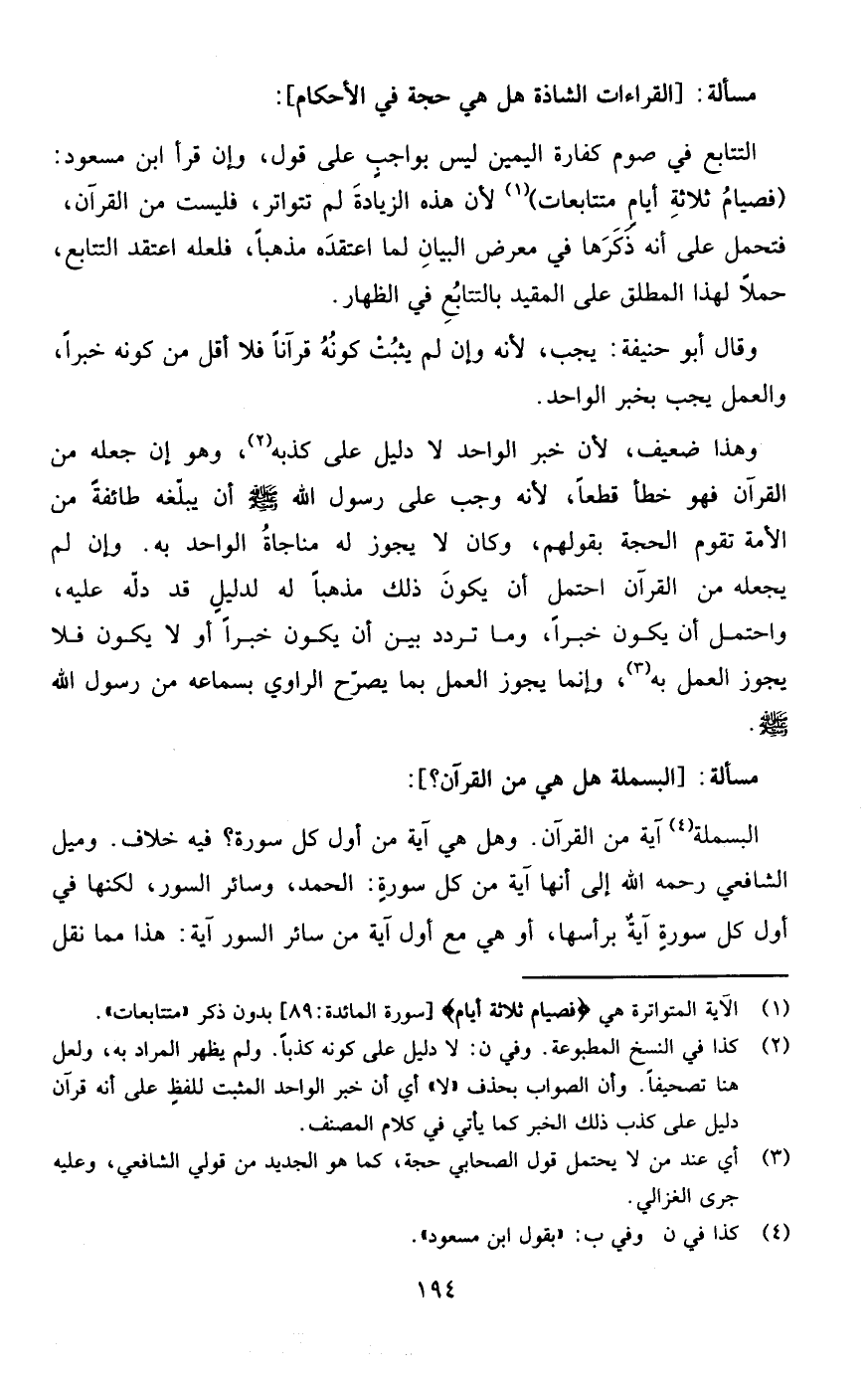 وهذا ضعيف لأن خبر الواحد لا دليل على كذبه وهو أن جعله من القرآن فهو خطأ قطعا لأنه وجب على رسول الله صلى الله عليه وسلم أن يبلغه طائفة من الأمة تقوم الحجة بقولهم وكان لا يجوز له مناجاة الواحد به وإن لم يجعله من القرآن احتمل أن يكون ذلك مذهبا له لدليل قد دله عليه واحتمل أن يكون خبرا وما تردد بين أن يكون خبرا أو لا يكون فلا يجوز العمل به وإنما يجوز العمل بما يصرح الراوي بسماعه من رسول الله صلى الله عليه وسلم مسألة: [هل البسملة آية أم لا]
