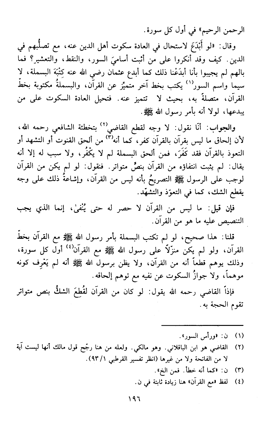 والجواب: أنا نقول لا وجه لقطع القاضي بتخطئة الشافعي رحمه الله لأن إلحاق ما ليس بقرآن بالقرآن كفر كما أنه من ألحق القنوت أو التشهد أو التعوذ بالقرآن فقد كفر فمن ألحق البسملة لم لا يكفر ولا سبب له إلا أنه يقال لم يثبت انتفاؤه من القرآن بنص متواتر فنقول لو لم يكن من القرآن لوجب على الرسول صلى الله عليه وسلم التصريح بأنه ليس من القرآن وإشاعة ذلك على وجه يقطع الشك كما في التعوذ والتشهد.