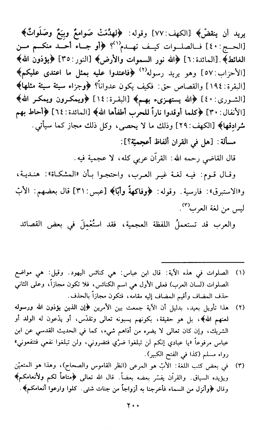 يُرِيدُ أَنْ يَنْقَضَّ } [الكهف :77] وقوله { لَهُدِّمَتْ صَوَامِعُ وَبِيَعٌ وَصَلَوَاتٌ } [ الحج :40 ] فالصلوات كيف تهدم؟ { َأوْ جَاءَ أَحَدٌ مِنْكُمْ مِنَ الْغَائِطِ} [المائدة:6] { اللَّهُ نُورُ السَّمَاوَاتِ وَالأَرْضِ } [النور :35] {يُؤْذُونَ اللَّهَ} [ الأحزاب: 57] وهو يريد رسوله { الشَّهْرُ الْحَرَامُ بِالشَّهْرِ الْحَرَامِ وَالْحُرُمَاتُ قِصَاصٌ فَمَنِ اعْتَدَى عَلَيْكُمْ فَاعْتَدُوا عَلَيْهِ بِمِثْلِ مَا اعْتَدَى عَلَيْكُمْ وَاتَّقُوا اللَّهَ وَاعْلَمُوا أَنَّ اللَّهَ مَعَ الْمُتَّقِينَ } [ البقرة:194] والقصاص حق فكيف يكون عدوانا ؟{ وَجَزَاءُ سَيِّئَةٍ سَيِّئَةٌ مِثْلُهَا } [الشورى: من الآية40] { اللَّهُ يَسْتَهْزِئُ بِهِمْ } [البقرة:14] {وَيَمْكُرُونَ وَيَمْكُرُ اللَّهُ} [الأنفال:30] {كُلَّمَا أَوْقَدُوا نَاراً لِلْحَرْبِ أَطْفَأَهَا اللَّهُ} [المائدة:64] {أَحَاطَ بِهِمْ سُرَادِقُهَا } ]الكهف: من الآية29[وذلك ما لا يحصى وكل ذلك مجاز كما سيأتي