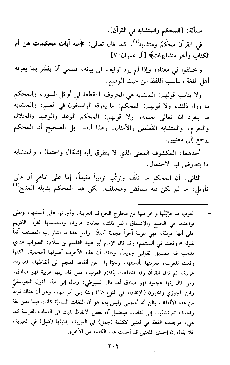 ولا يناسبه قولهم المتشابه هي الحروف المقطعة في أوائل السور والمحكم ما وراء ذلك ولا قولهم المحكم ما يعرفه الراسخون في العلم والمتشابه ما ينفرد الله تعالى بعلمه ولا قولهم المحكم الوعد والوعيد والحلال والحرام والمتشابه القصص والأمثال وهذا أبعد بل الصحيح أن المحكم يرجع إلى معنيين: