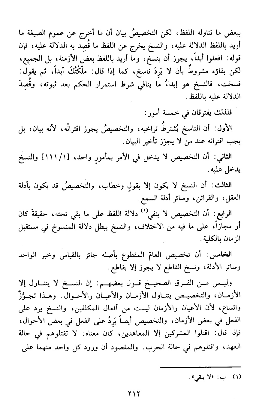الرابع: أن التخصيص يبقى دلالة اللفظ على ما بقي تحته حقيقة كان أو مجازا على ما فيه من الاختلاف والنسخ يبطل دلالة المنسوخ في مستقبل الزمان بالكلية