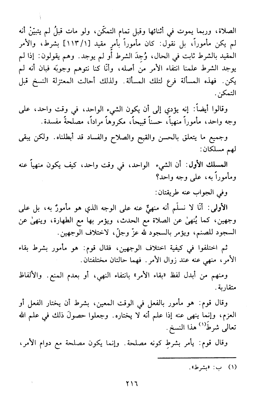 وقال قوم: هو مأمور بالفعل في الوقت المعين بشرط أن يختار الفعل والعزم وإنما ينهى عنه إذا علم أنه لا يختاره وجعلوا حصول ذلك في علم الله تعالى بشرط هذا النسخ