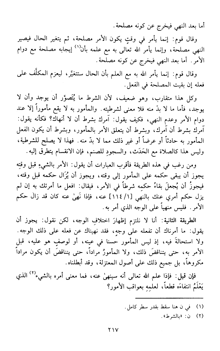 وكل هذا متقارب وهو ضعيف لأن الشرط ما يتصور أن يوجد وأن لا يوجد فإما ما لا بد منه فلا معنى لشرطيته والمأمور لا يقع مأمورا إلا عند دوام الأمر وعدم النهي فكيف يقول آمرك بشرط أن لا أنهاك فكأنه يقول آمرك بشرط أن آمرك وبشرط أن يتعلق الأمر بالمأمور وبشرط أن يكون الفعل المأمور به حادثا أو عرضا أو غير ذلك مما لا بد منه فهذا لا يصلح للشرطية وليس هذا كالصلاة مع الحدث والسجود للصنم فإن الانقسام يتطرق إليه