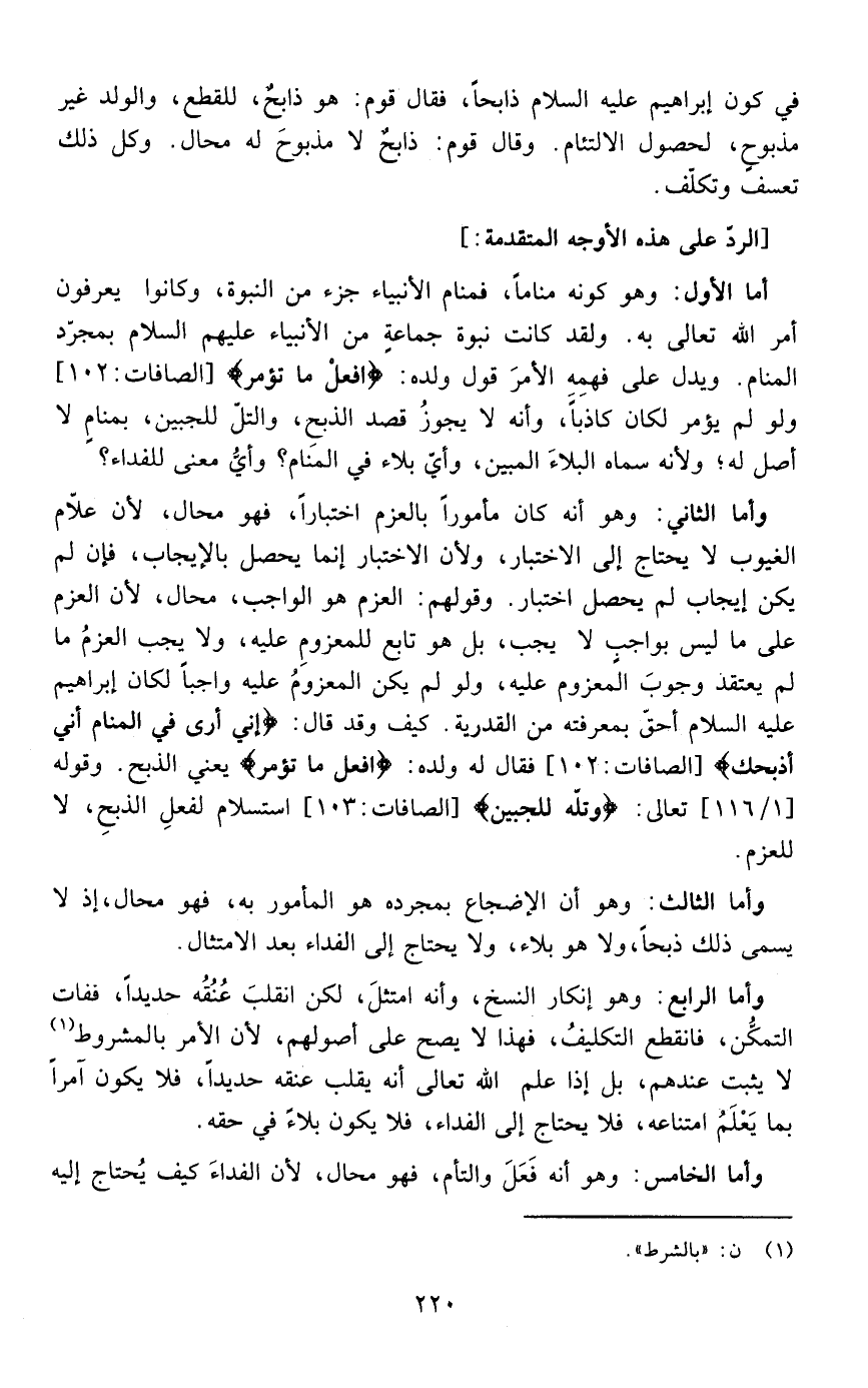 وأما الثاني: وهو أنه كان مأمورا بالعزم اختبارا فهو محال لأن علام الغيوب لا يحتاج إلى الاختبار ولأن الاختبار إنما يحصل بالإيجاب فإن لم يكن إيجاب لم يحصل اختبار وقولهم العزم هو الواجب محال لأن العزم على ما ليس بواجب لا يجب بل هو تابع للمعزوم ولا يجب العزم ما لم يعتقد وجوب المعزوم عليه ولو لم يكن المعزوم عليه واجبا لكان إبراهيم عليه السلام أحق بمعرفته من القدرية كيف وقد قال { إِنِّي أَرَى فِي الْمَنَامِ أَنِّي أَذْبَحُكَ } [الصافات:102[فقال له ولده {افْعَلْ مَا تُؤْمَرُ} [الصافات :102] يعني الذبح وقوله تعالى { وَتَلَّهُ لِلْجَبِينِ} [ الصافات: من الآية103] استسلام لفعل الذبح لا للعزم